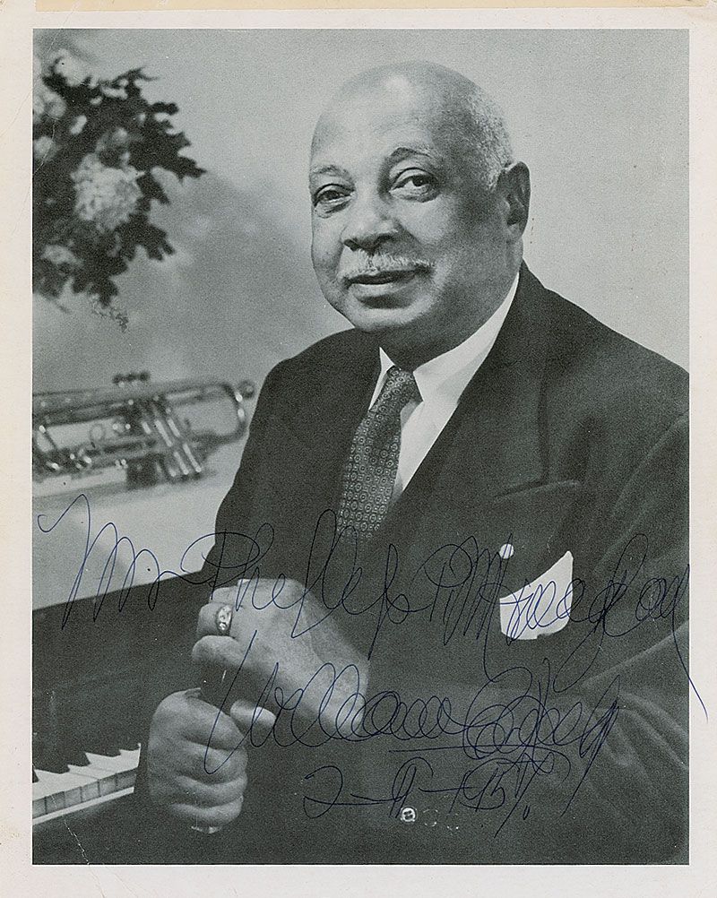 Vintage 8 x 10 cardstock photo, inscribed in blue ballpoint and signed “William C. Handy 2/9/1951.” Scattered creases, primarily to corners, and a thin mounting remnant along top edge, otherwise fine condition.