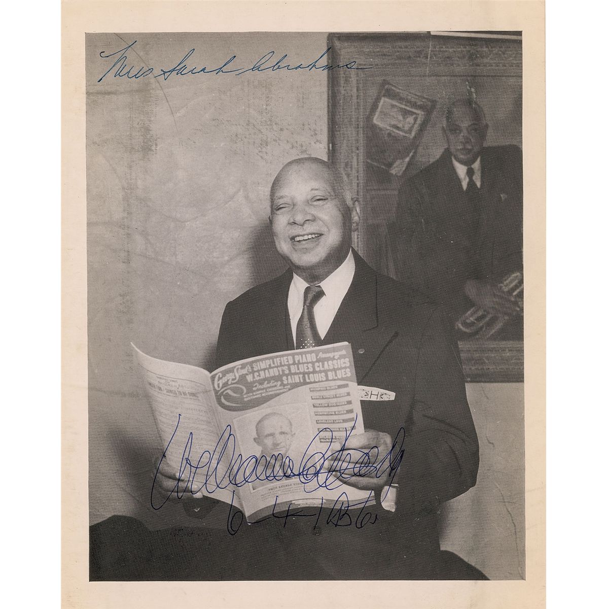 Cardstock 8 x 10 photo of Handy thumbing through some of his sheet music, signed in blue ballpoint, “William C. Handy, 6-4-1956,” with a brief inscription along the top in another hand. In fine condition, with a few dings to corner tips.
