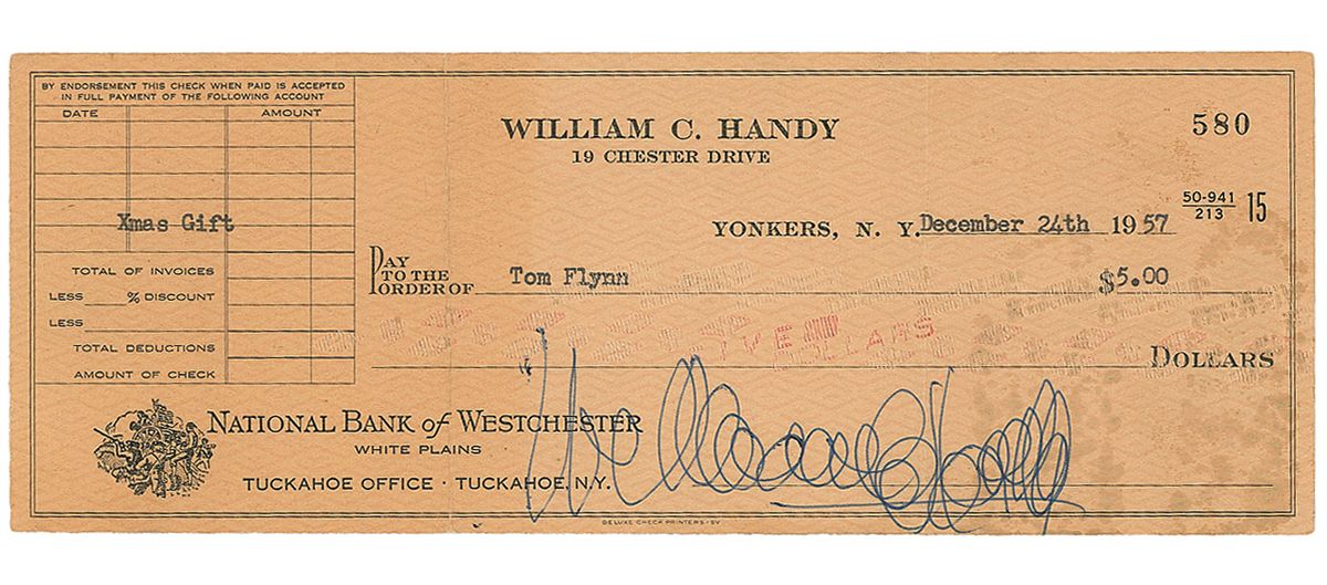 Personal check, 8.25 x 3, filled out in type and signed by Handy, “William C. Handy,” payable to Tom Flynn for $5.00, December 24, 1957. In very good condition, with two vertical folds, one through a single letter of signature, expected stamps, and some dampstaining to lower right over end of signature.