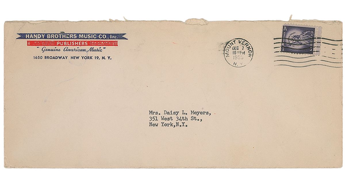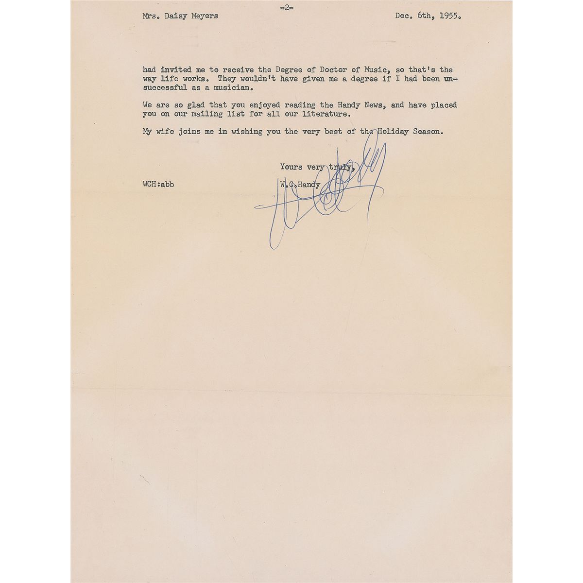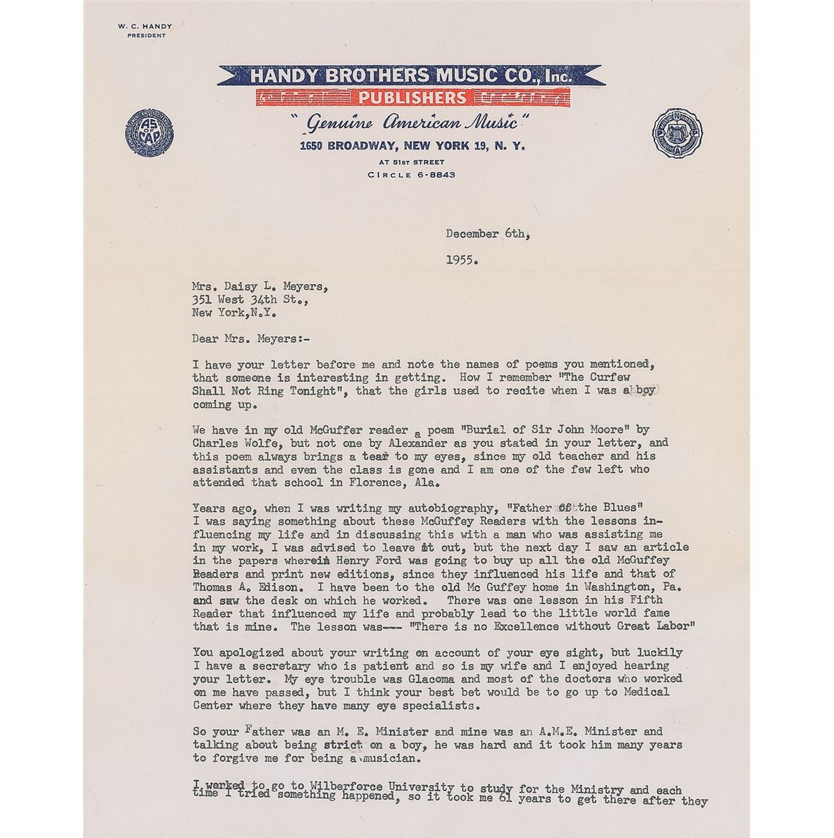 TLS, two pages, 8.5 x 11, Handy Brothers Music Co., Inc. Publishers letterhead, December 6, 1955. Letter to Daisy L. Meyers. In part: “We have in my old McGuffey reader a poem ‘Burial of Sir John Moore’ by Charles Wolfe, but not one by Alexander as you stated…Years ago, when I was writing my autobiography, ‘Father of the Blues’ I was saying something about these McGuffey Readers with the lessons influencing my life…There was one lesson in his Fifth Reader that influenced my life and probably led to the little world fame that is mine. The lesson was—‘There is no Excellence without Great Labor.’” In fine condition. Accompanied by the original mailing envelope.