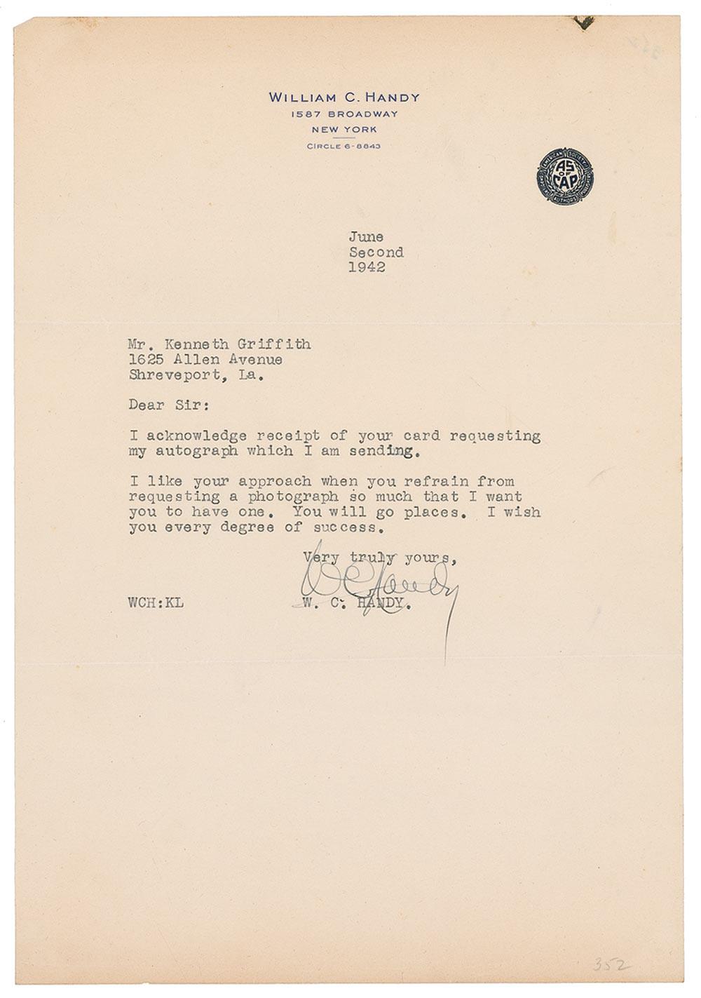 TLS, one page, 7.25 x 10.5, personal letterhead, June 2, 1942. Letter to a collector. In full: “I acknowledge receipt of your card requesting my autograph which I am sending. I like your approach when you refrain from requesting a photograph so much that I want you to have one. You will go places. I wish you every degree of success.” In fine condition, with some mild edge toning, and a small pencil notation to bottom right corner.