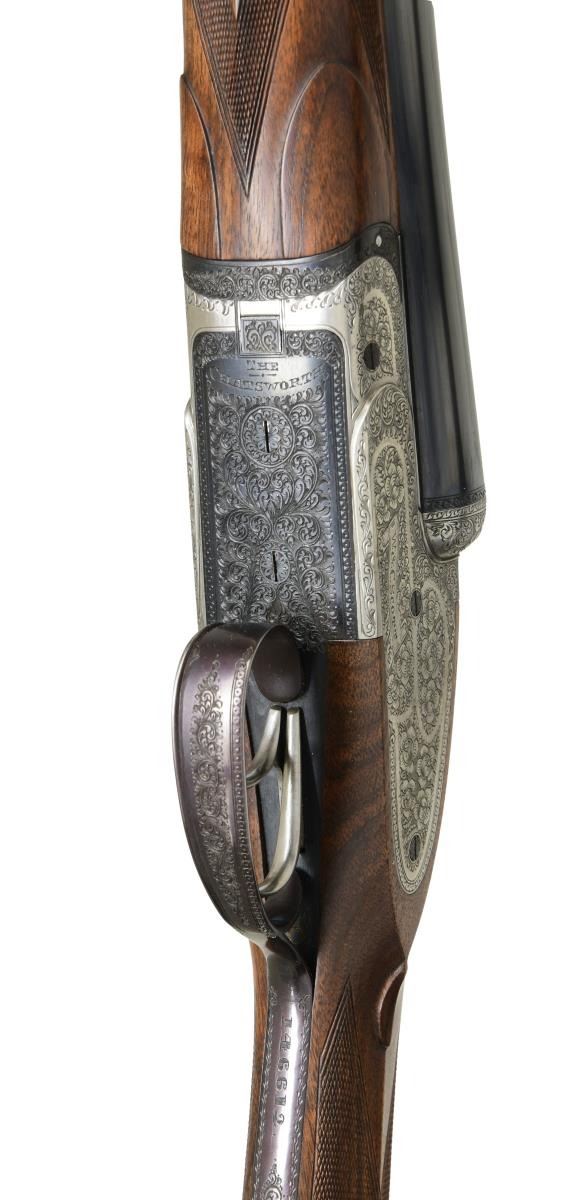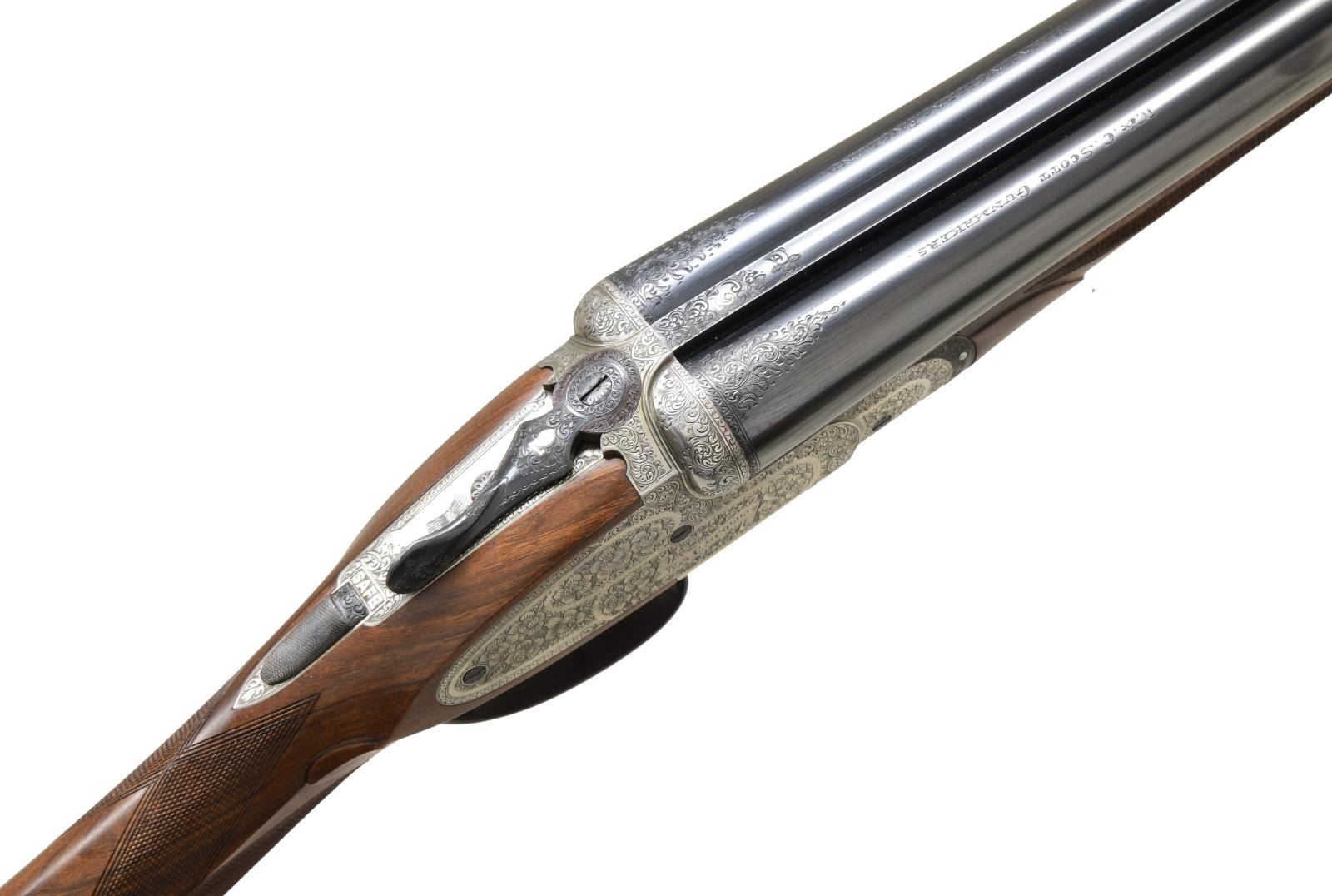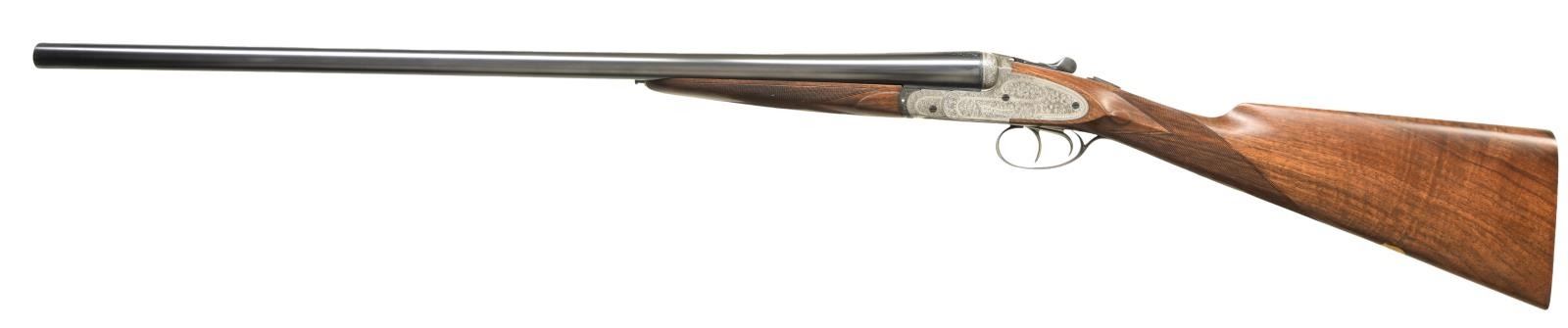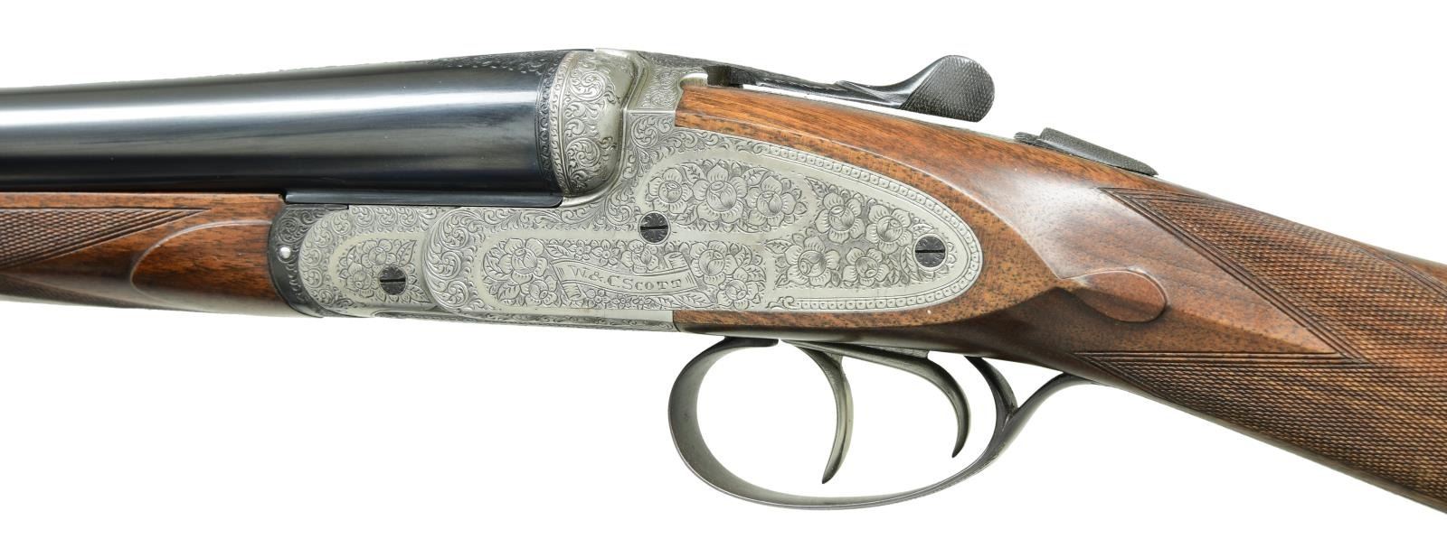 SHOTGUNS. Both cals. 12 ga. 2 3/4". Both bbls. 28" w/ sunken concave ribs. Nitro proofed for 3 1/4 tons. Sideplated boxlock actions. Satin finished receivers w/ blued floorplates have full coverage rose & scroll ornamentation. Features include selective ejectors & double triggers. Trigger guards have rolled right edges. Splinter forearms & straight hand stocks of fancy English walnut w/ point pattern checkering & teardrop points. Brass name shields in toelines are engraved w/ initials "RS". LOP: 14 7/8" to checkered butt. DAC: 1 1/2". DAH: 2 3/16". Stocks have approx. 1/4" cast off. WEIGHTS: both 6 lbs, 8.2 oz. 1) S# 146612. Breech end of bbl. & top lever have gold number "1s" indicating first gun of matched pair. Bore diameter: R .727 L .727. Choke constriction: R .010 L .029. Minimum wall thickness: R .028 L .031. CONDITION: near excellent retaining over 98% original finish showing only a few fine scratches & marks. Action is tight & on face w/ top lever sitting nicely right of center. Bright near excellent bores. 2) S# 146613. Breech end of bbl. & top lever have gold number "2s" indicating second gun of matched pair. Bore diameter: R .727 L .727. Choke constriction: R .010 L .024. Minimum wall thickness: R .032 L .031. CONDITION: near excellent retaining over 95% wood & metal finish showing only a few small marks. Action is tight & on face w/ top lever sitting right of center. Bright near excellent bores. UNATTACHED ACCESSORIES: leather covered 2 bbl. case w/ maroon velour fitted interior having maker's label. Case contains 2 piece cleaning rod, oil bottle, 4 snap caps, turn screws & cleaning accessories. W & C Scott Gunworks hang tags w/ serial numbers & specifications for each gun are included. (24-2177, 24-2178/DS). BOTH CURIOS. $5,000-9,000.