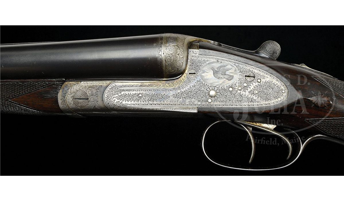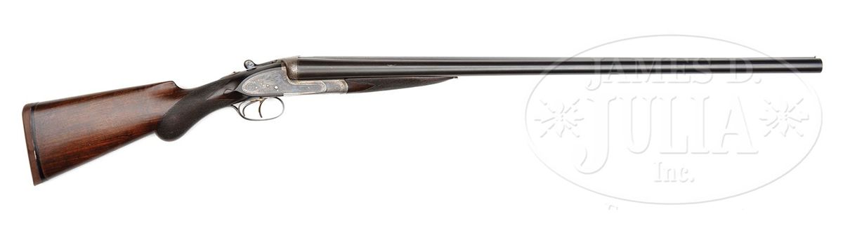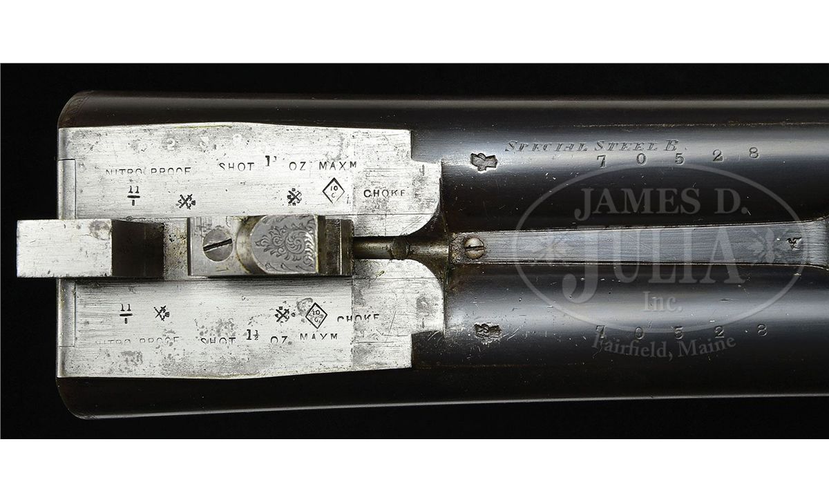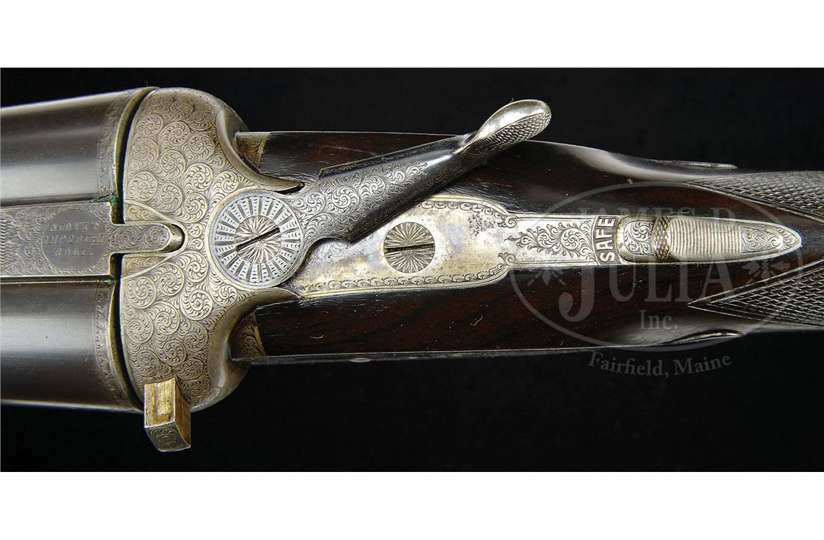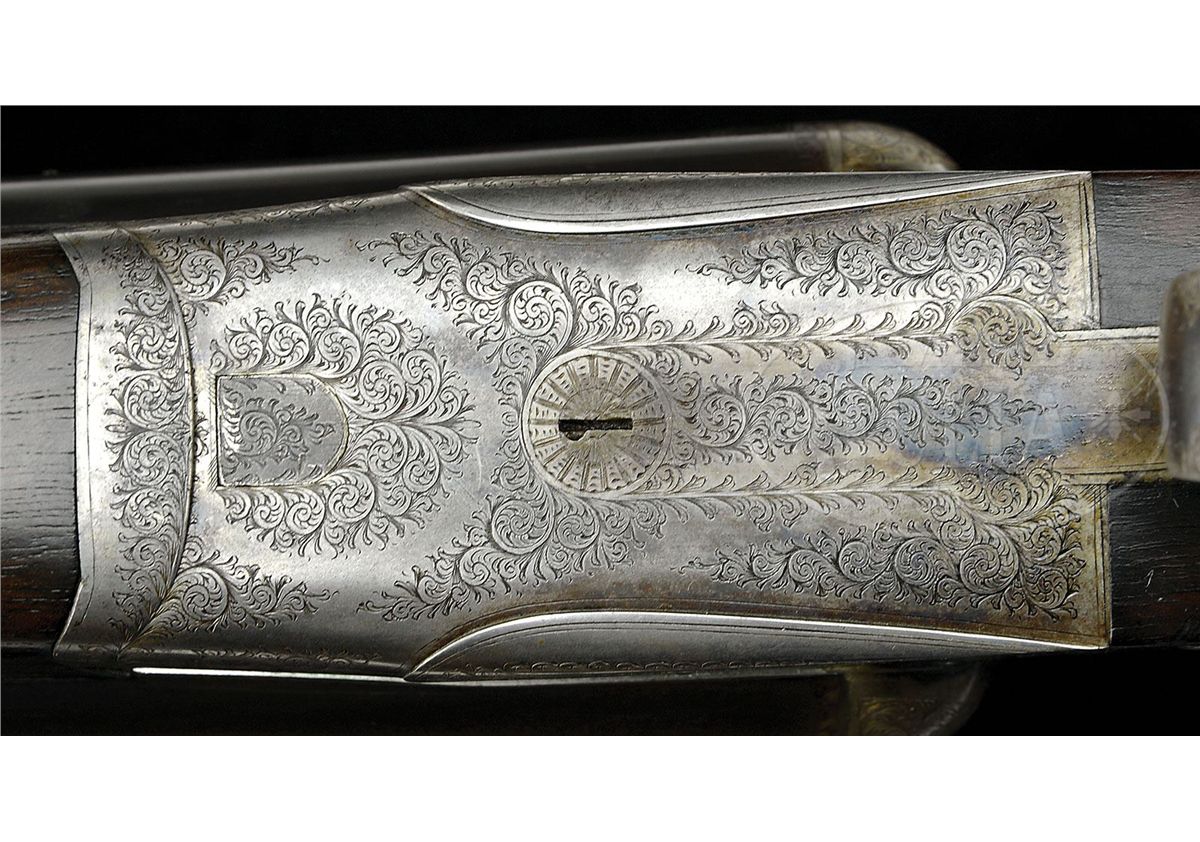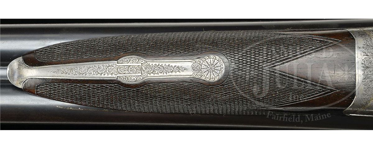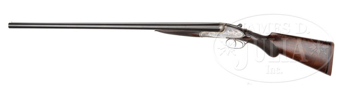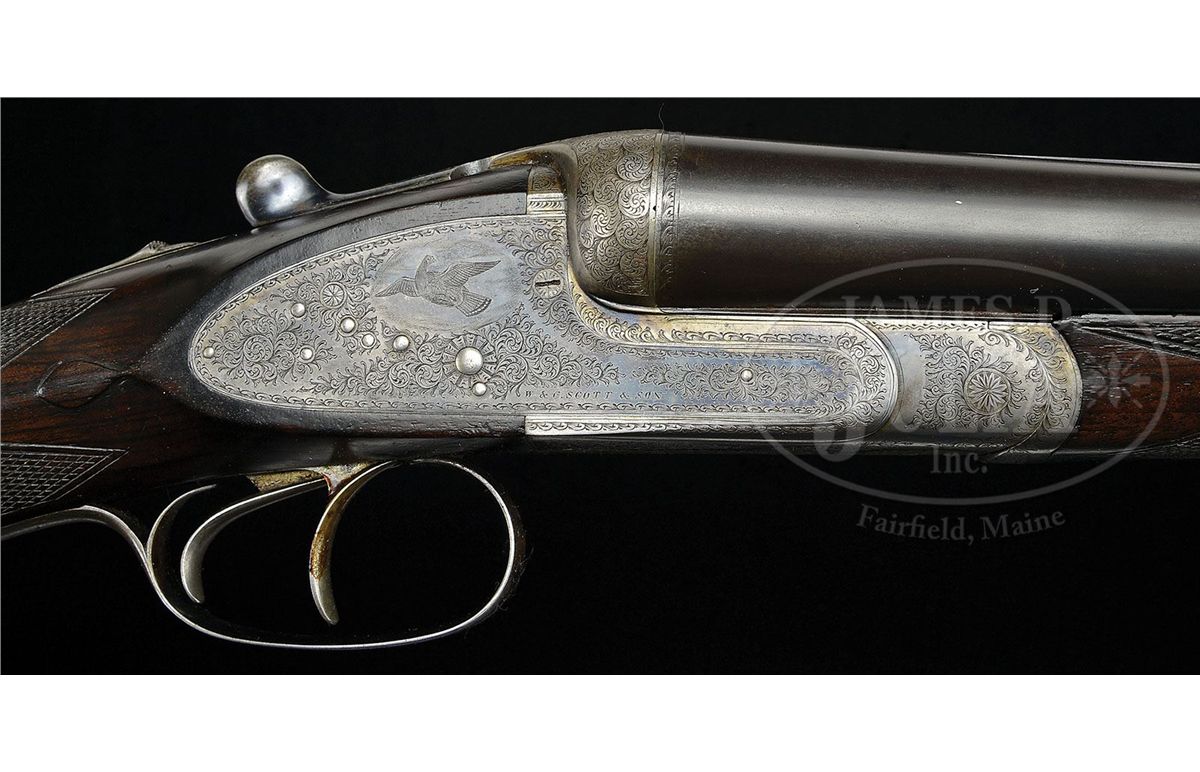 ADDITIONAL INFORMATION (09-23-13): W.C. Scott information letter states total production of 10 ga. Monte Carlo B guns is estimated at less than 100. SN 70528. Cal. 10 ga. 2-7/8" Chambers. 30" Dovetailed steel bbls with broad, flat, matted rib, engraved "Scott's Improved Bolt" at breech end, are engraved "W. & C. Scott & Son" "MONTE CARLO B" and "78 Shaftesbury Avenue. London. England" on tops. Bbl flats are stamped with Birmingham nitro proofs for 1-1/2 oz of shot. Bottoms of bbls are stamped with SN and bottom of right bbl engraved "Special Steel B". Case hardened sidelock action with rounded bar features automatic safety (SAFE relief engraved), square crossbolt third fastener, Scott patent gas checks, and double triggers. Action is engraved with about 80% coverage cleanly cut medium scroll with near full coverage on fences. Lockplates are engraved with matching scroll and oval vignettes of pigeons in flight, as well as "W & C Scott & Son" at the bottom of each plate. Scroll engraved trigger guard has SN at grip. Dense, closely streaked European walnut semi pistol grip buttstock measures 13-3/4" over brown "Old English" pad, and features drop points, flat top point pattern checkering, and a vacant silver oval on toe line. Matching short, splinter forend has Scott's patented pull down lever release. Bore diameter: left-.775, right -.775. Bore restrictions: left -.040 (Full), right -.032 (Mod). Wall thickness: left -.044, right -.041. Drop at heel: 2-13/16", drop at comb: 1-7/16". Weight: 10 lbs. 1 oz. LOP: 13-3/4". PROVENANCE: W.C. Scott information letter states total production of 10 ga. Monte Carlo B guns is estimated at less than 100. CONDITION: Very fine plus. Bbls retain 90 - 95% orig blue, silvered on sharp edges, and thinning at normal carry point. Action and lockplates retain most of their orig case hardening color, quite vivid where protected. Top lever retains most of its blue, silvered on thumbpiece. Trigger guard retains traces of its orig blue. Stocks retain most of their orig finish with numerous light marks and minor dents, checkering slightly worn. Replacement pad needs some cleaning up. Bores are excellent. Action is tight. Bbls are on face. A well balanced, solid, working ten bore. 4-48693 MGM59