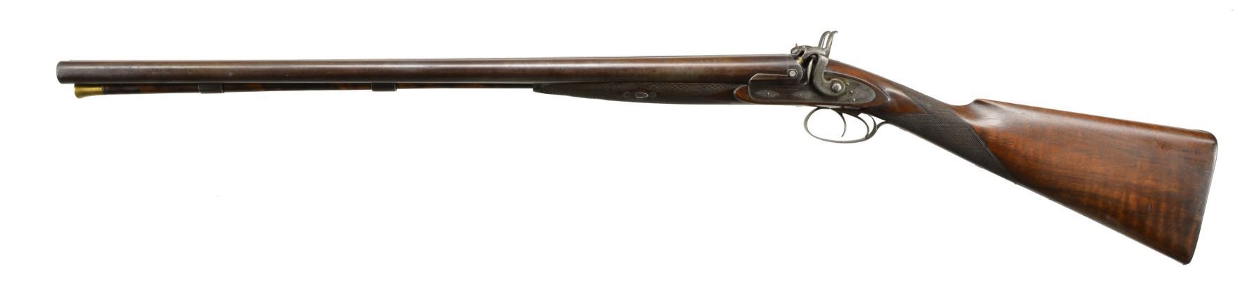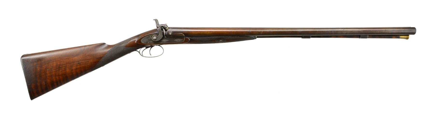 Cal. 10 Ga. S# 10595. Bbl. 28" of Laminated Steel & fixed Cyl. & Cyl. bores. Rib is marked "W & C. SCOTT & SON. LONDON. Laminated Steel". Lock plates & hammers have generous coverage of English arabesque scroll engraving along w/ maker's name. Key fastened straight hand stock of fine English walnut w/ hand checkering at wrist & forearm has oval name plate in toeline. LOP: 14 1/4" over steel shotgun buttplate. Brass tipped hardwood ramrod is held by 2 plain iron pipes. WEIGHT: 7 lbs., 3.6 oz. CONDITION: bbls. retain 80% lightly faded browned finish showing spots of corrosion & sm. handling marks. Locks & hammers show some lightly visible case colors. Stock shows scattered marks & scratches w/ sm. chips on forearm along right bbl. channel. Ramrod has coat of added gloss finish. Stock attachment key is chipped at leading edge of head. Nipples are modern replacement indicating recent use. Left hammer has a chipped cup. Bores have dark frosted appearance w/ scattered light pitting. (01-16133/DS). ANTIQUE. $500-900.
