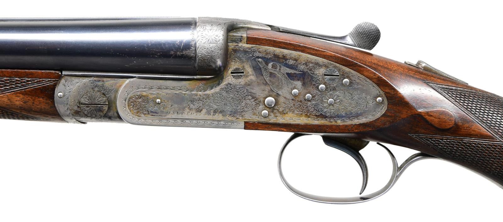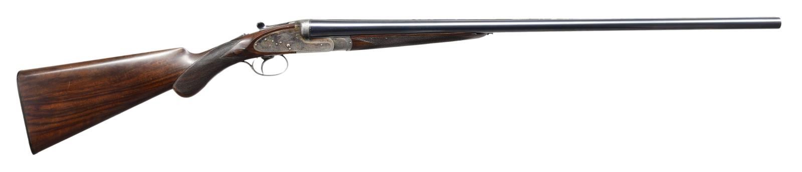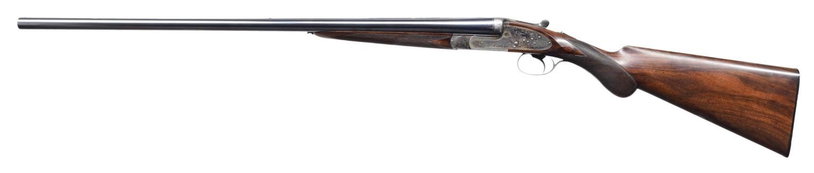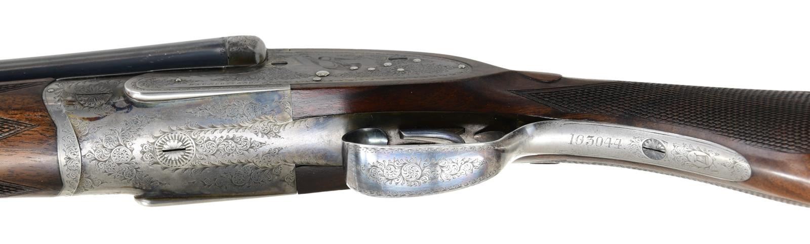 Cal. 20 ga. 2 1/2". S# 103044. Bbls. 26" chopper lump w/ ivory front & mid beads. Nitro proofs for 7/8 oz of shot. Sidelock action w/ double underlug & crossbolt locking. Single selective trigger. Selective ejectors. Case colored action has arabesque scroll engraving featuring pigeons on the lockplates. Splinter forearm & round knob stock of fancy English walnut w/ point pattern hand checkering & tear drop points. Toeline has German Silver oval nameplate. LOP: 14" over a grooved horn buttplate. DAC: 1 9/16". DAH: 2 3/4". Bore diameters: R .614 L .616. Choke constriction: R .010 L .029. Minimum wall thickness: R .032 L .032. WEIGHT: 5 lbs, 8.6 oz. UNATTACHED ACCESSORIES: oak & leather case w/ maker's label. Case contains 2 piece cleaning rod, snap caps, oil bottle, accessory bottle & cleaning accessories. CONDITION: 97% bbl. blue. Action retains 80% case colors showing carry wear. Wood has good finish & checkering showing scattered scratches & marks. Forearm has a small chip along right bbl. channel near the tip. Action is tight & on face w/ top lever sitting at center. Very good bright bores. (24-2182/DS). CURIO. $6,000-9,000.