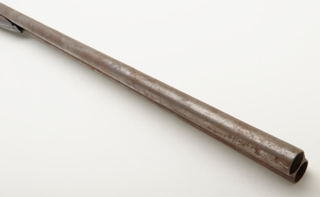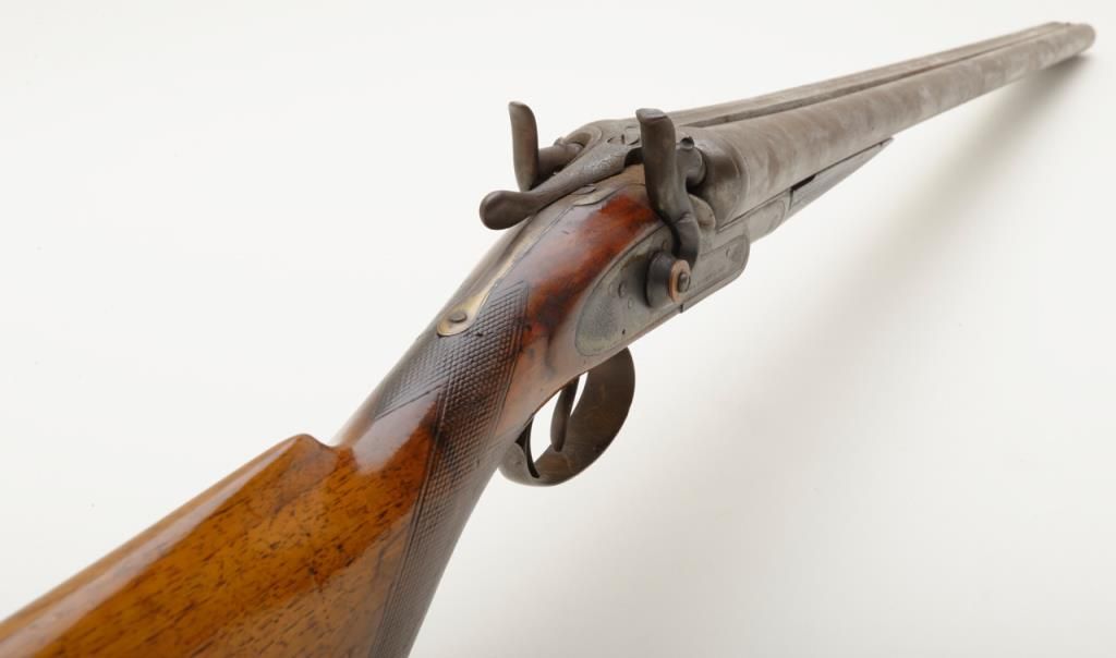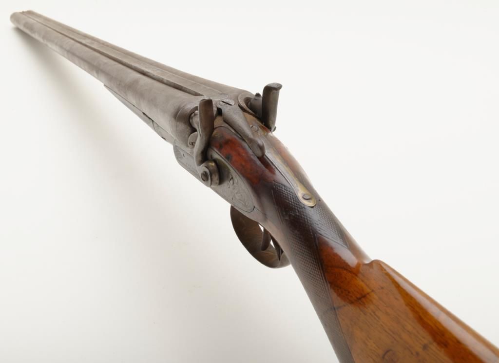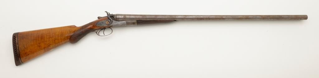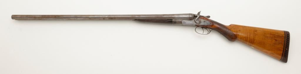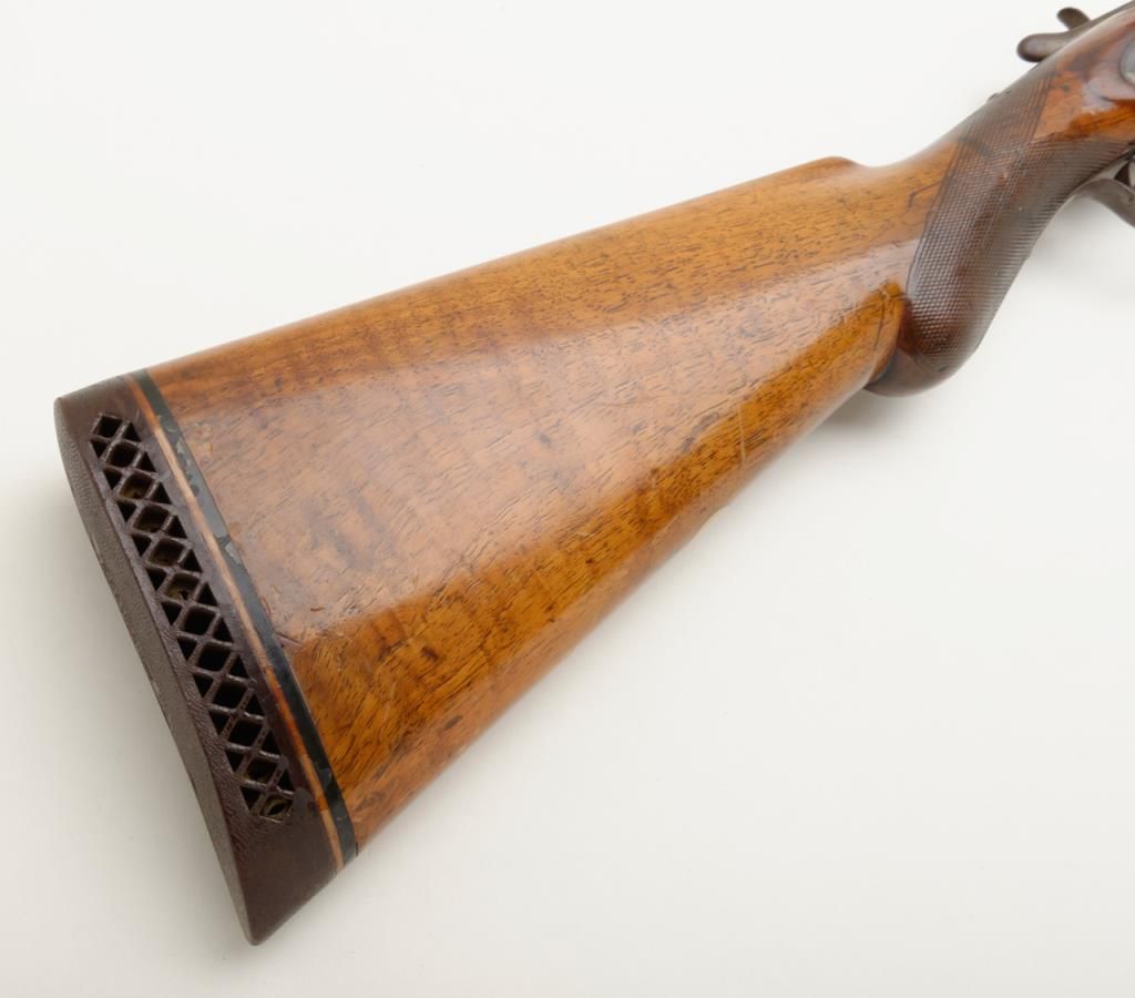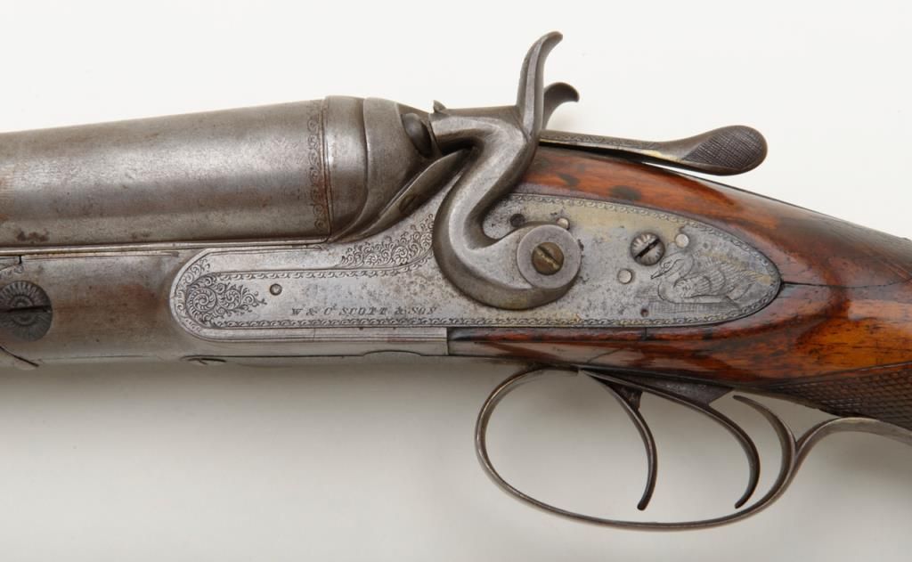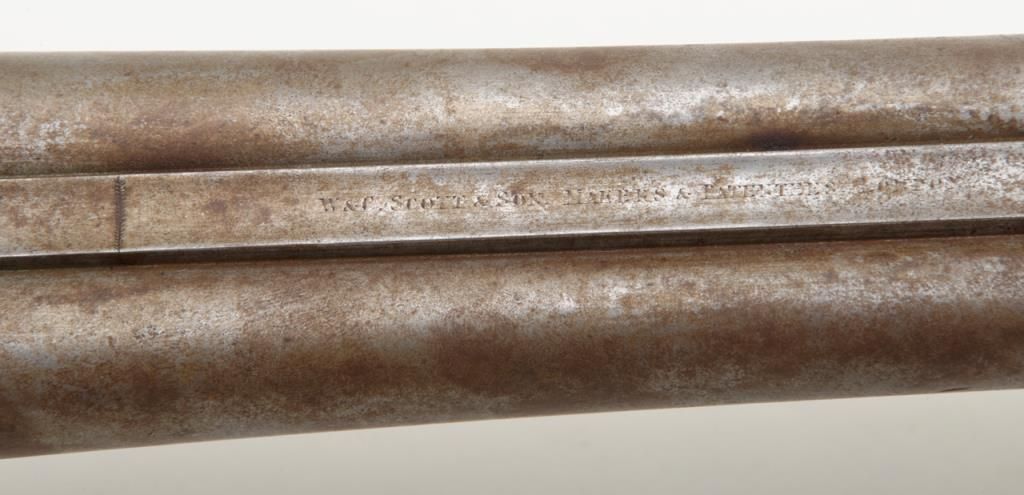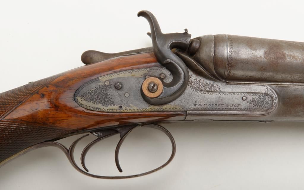 W.C. Scott & Son side by side 12 Gauge shotgun with 30 " Damascus barrels. The shotgun is in overall good condition with all metal gone to silver, with period scroll engraving and significant surface rust to barrels exterior. The bores are good and may clean. The lever is marked "W.C. Scott & Sons Patent" The stock is in need of repair due a crack extending from the back of action behind the tang. The stock has had a period re-finish and Pachmayr ventilated pad added. A neat old shotgun that would benefit from some TLC. Est.: $250-$500. (Antique)