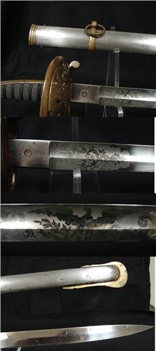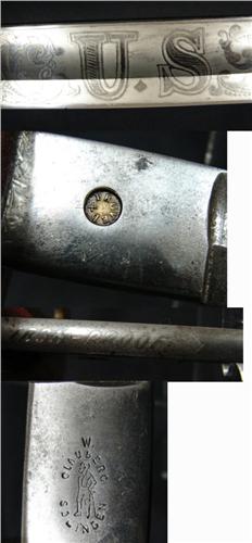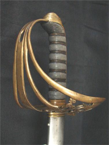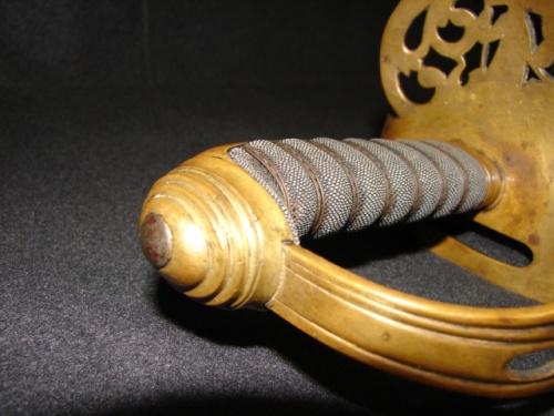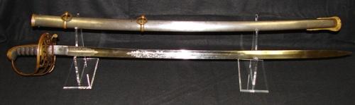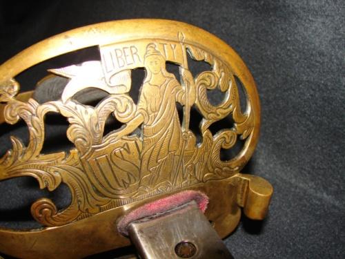 W. CLAUBERG NON-REGULATION 1840 OFFICER’S SWORD & SCABBARD. Has unique brass hilt. Half-basket type guard with a knuckle-bow and two fullers on the obverse side and one fuller on the reverse side all joining the counter-guard. Counter-guard is uniquely decorated with lady Liberty holding a flag that reads “LIBERTY” and a shield that reads “US”. Sharkskin grip with copper wire wrap. Blade is ornately decorated. Ricasso is marked “W. CLAUBERG/SOLINGEN” and side of blade is marked “IRON-PROOF”. Scabbard is correct. Steel scabbard has brass throat, two brass rings, and brass drag. Non-regulation swords with brass hilts are uncommon, as most were made with steel hilts. Sword and scabbard are both in excellent condition. Total length: 37 ¼”, Blade length: 32”