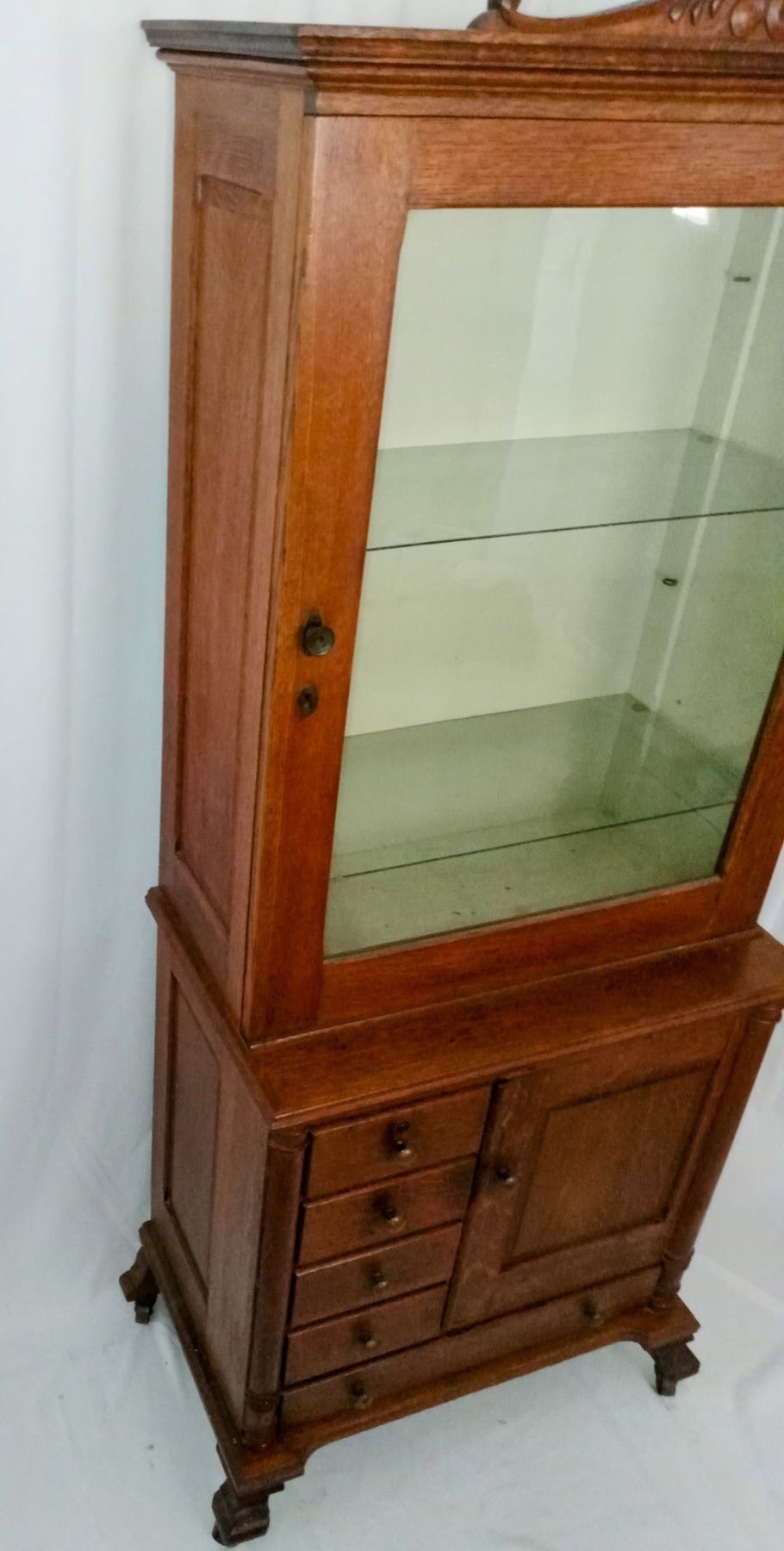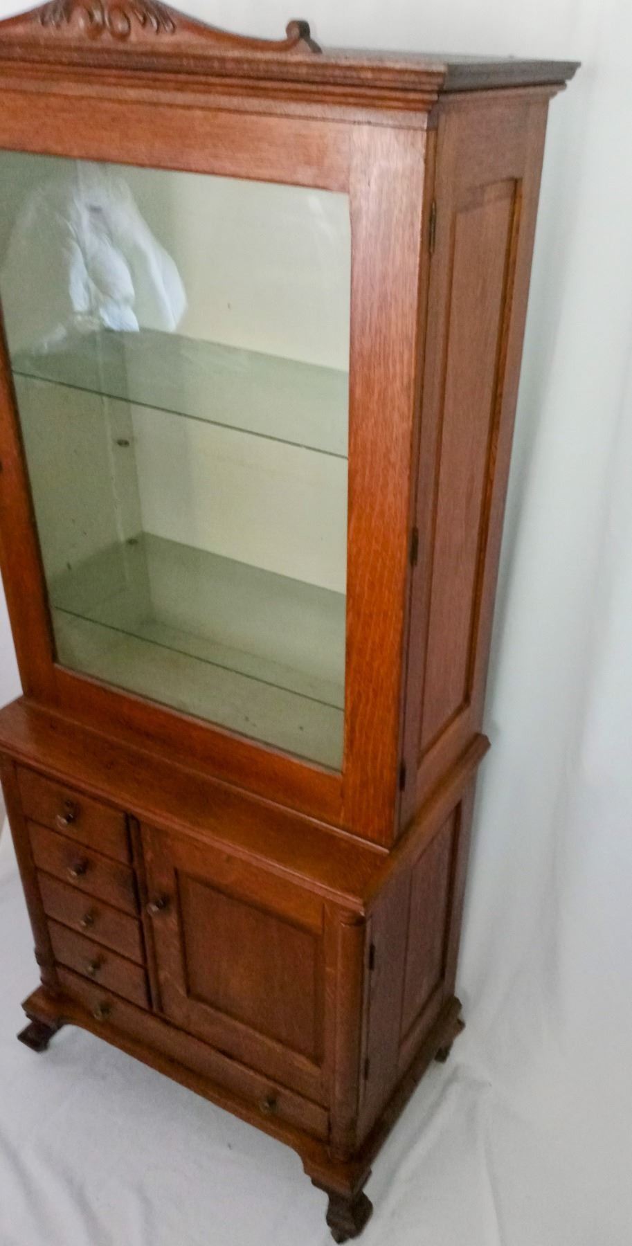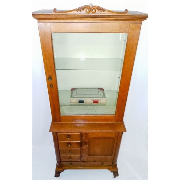 This W.D. Allison Co. vintage dental cabinet is made of oak with glass shelves and windows. W.D. Allison Co. was known for making well crafted furniture specifically, designed for physicians and doctors. The company was founded in the 1880's in Indianapolis, Indiana. Included is an old vintage ledger keepsake journal filed with notes, receipts, ect.