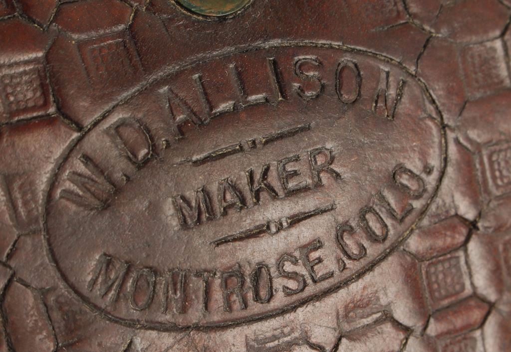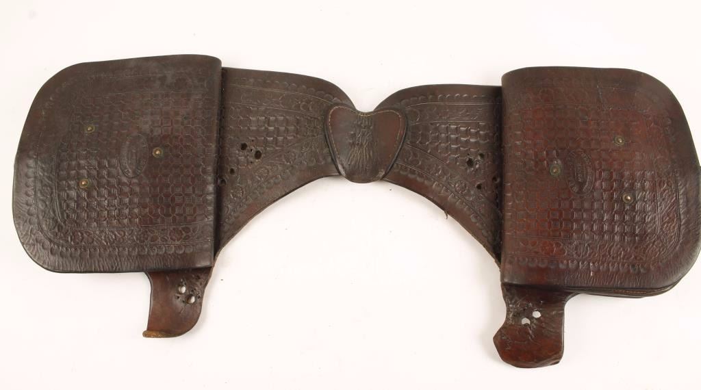 from Monrose Colorado, maker marked twice on bag flaps, brown leather with a square stamping. In fair to good condition. Circa 1930's-40's.