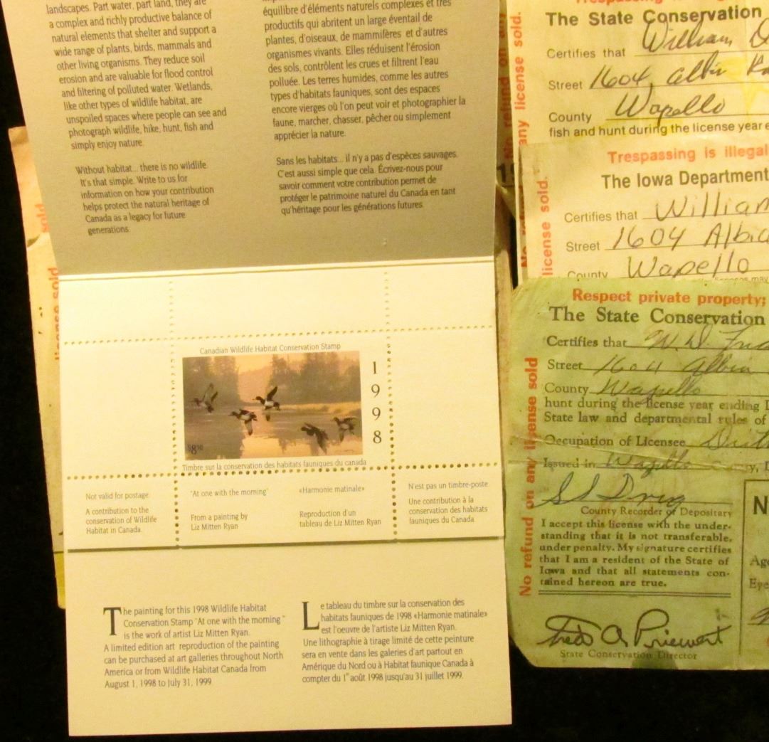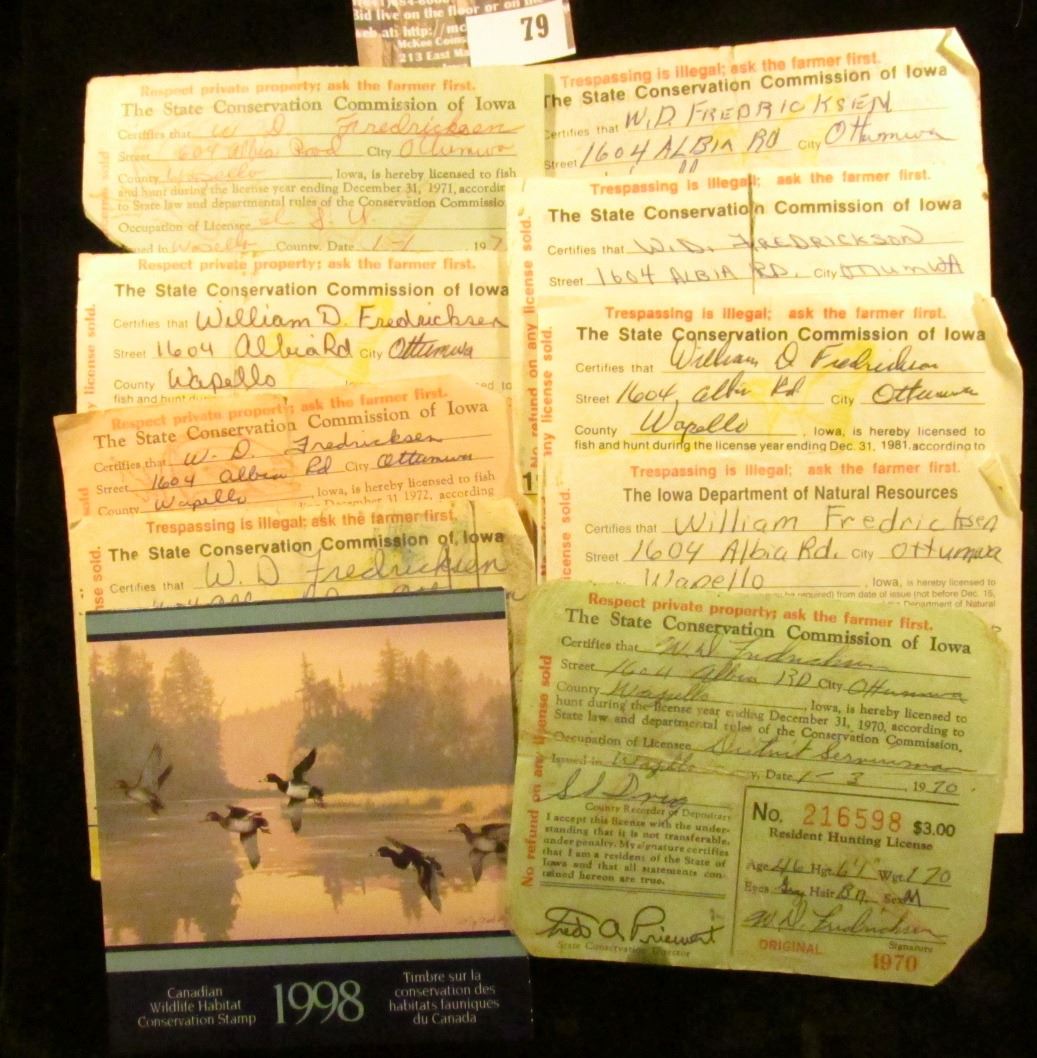 W.D. Fredricksen's of Ottumwa's 1970 Resident Hunting License & 1971,1972, 1979, 1981, 1982, 1983, 1984, & 1988 Resident Combination Fishing and Hunting Licenses "The State Conservation Commission of Iowa"; & 1988 "Canadian Wildlife Habitat Conservation Stamp" unissued in original packet depicting a flock of ducks.