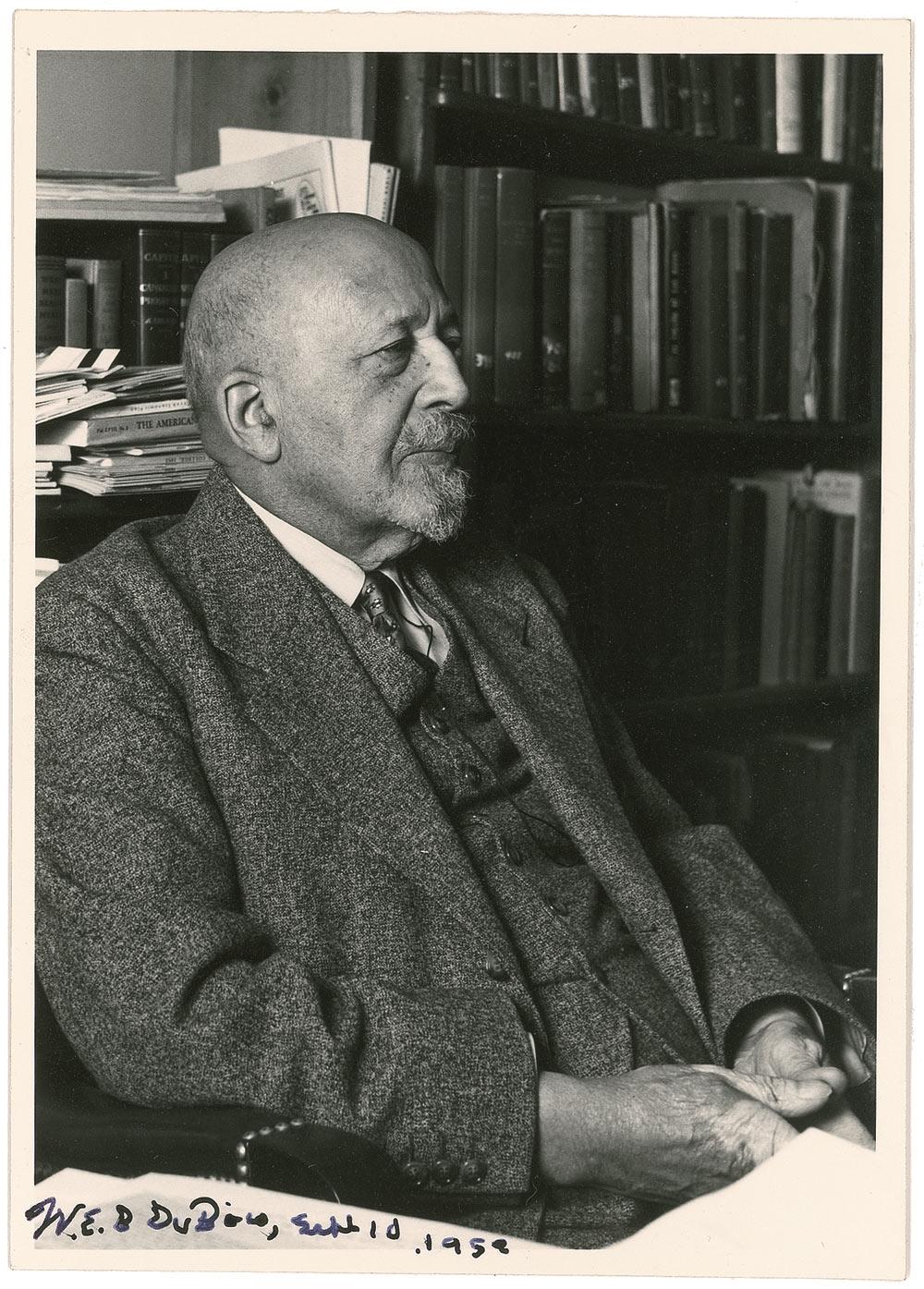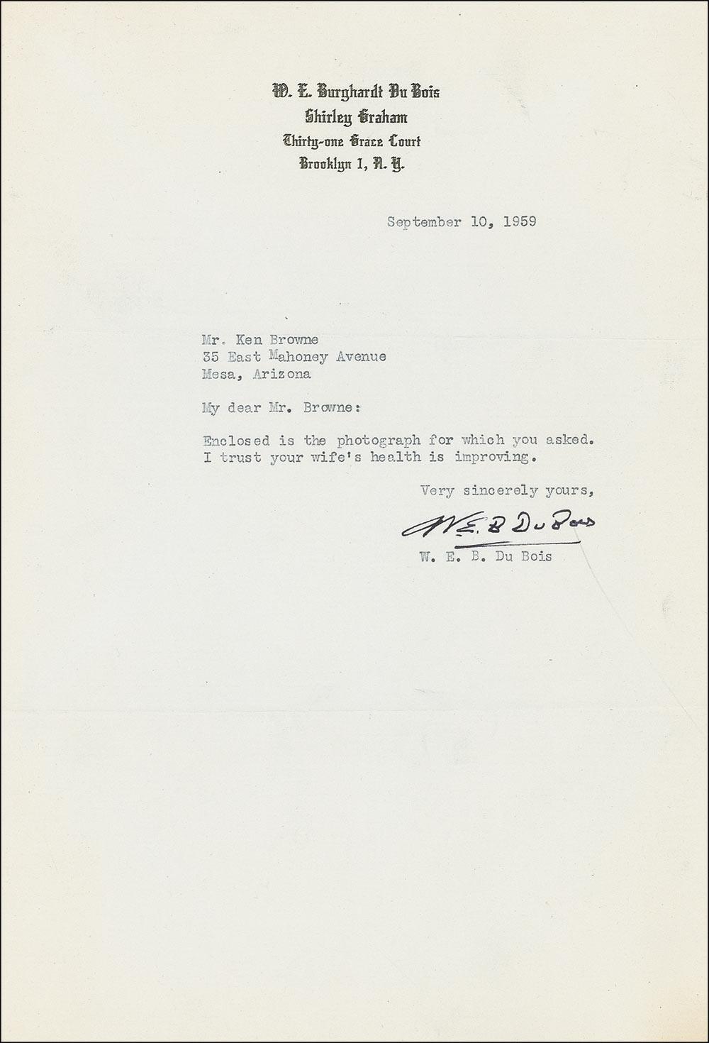 Influential black writer and educator who helped transform the prevailing view of his people’s role in America. Exceedingly rare vintage matte-finish 5 x 7 photo of DuBois in his study, signed in fountain pen “W. E. B. DuBois, Sept 10, 1959” near the lower edge. Accompanied by a brief TLS from the same date, signed “W. E. B. DuBois,” transmitting “the photo for which you asked.” Both items are in fine condition, with a light paperclip impression to the upper left corner of the photo. DuBois is scarce in any form, and this is the first signed photo we have ever seen. Provenance: The Barry Hoffman Collection.