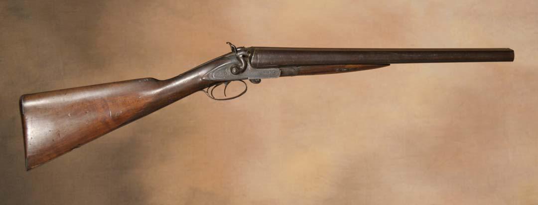 W. G. Rawbone Coach Shotgun. 18 ½" barrel, 35" overall. Double barrel sawed-off, inscribed "USX". 12 gauge, serial #8?2860. Circa 1880s. (est $800-1,200). For condition reports please visit: www.auctioninsantafe.com/cr2011.pdf