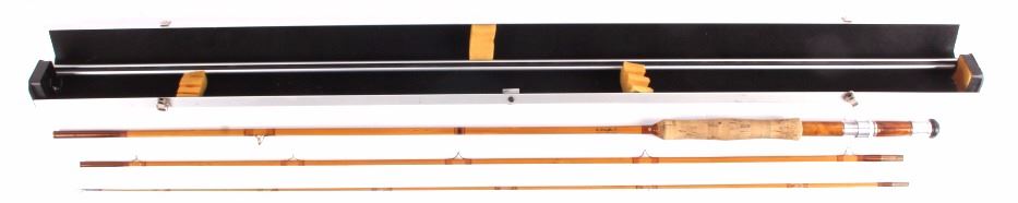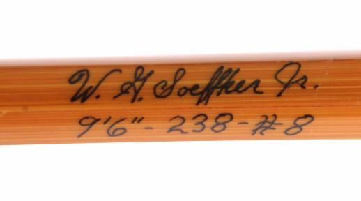 This is a RARE original custom bamboo fly rod made by W.G. Soeffker in 1979. This is a 3 piece, 8 weight rod that is 9'6". The rod is marked "W.G. Soeffker Jr. / 9'6"-238-#8 / 6-'79-002". Soeffker is a renowned rod maker known for his precision and attention to detail. The rod features a birdseye maple reel seat and cork handle. The rod was built entirely by hand and shows very good condition. The fly rod comes with an aluminum hard case. The case measures 2" x 2.25" and is 44.5" long.