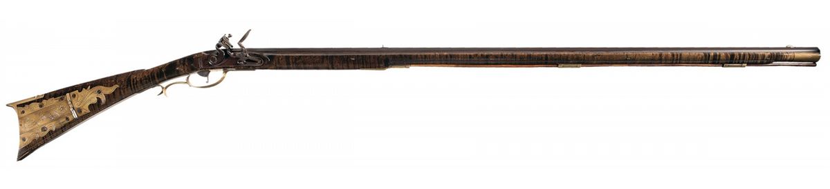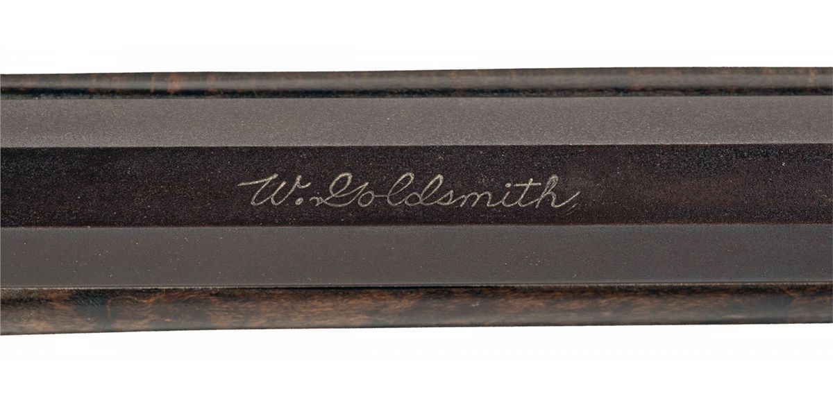 Fixed brass front sight blade and fixed rear sight with the top flat of the barrel marked in script "W. Goldsmith". The left side plate is brass and has some simple engraved decorative elements. The trigger guard has two crossed arrows with an axe engraved in a pentagon shape. The brass patch box has floral scroll engraving and there are small flourishes of engraving on the tangs of the buttplate and ramrod pipes. There is a silver inlaid half moon shape with a face engraved on the raised cheekpiece and there is a silver initial oval engraved "W/E/M" on the top of the wrist. Mounted on a full length tiger stripped stock held on with four small wedges. With a one-piece wooden ramrod.