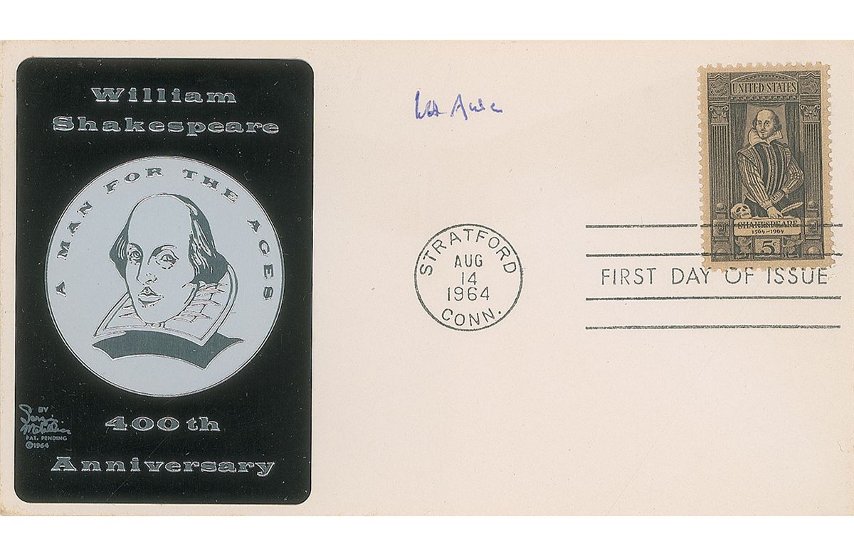 British-American poet (1907–1973) best known for such classic verses as ‘September 1, 1939’ and ‘The Age of Anxiety’ and for his musical collaborations with composer Benjamin Britten. FDC with a cachet honoring William Shakespeare, signed in blue ballpoint by Auden. In fine condition.
