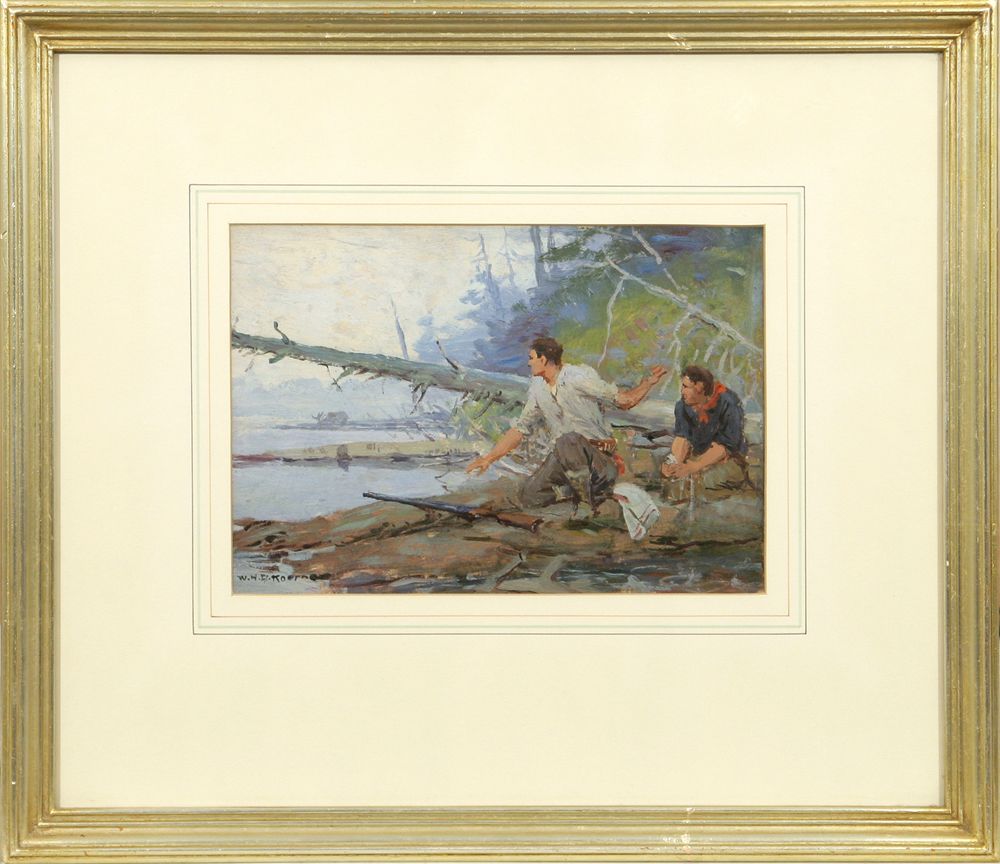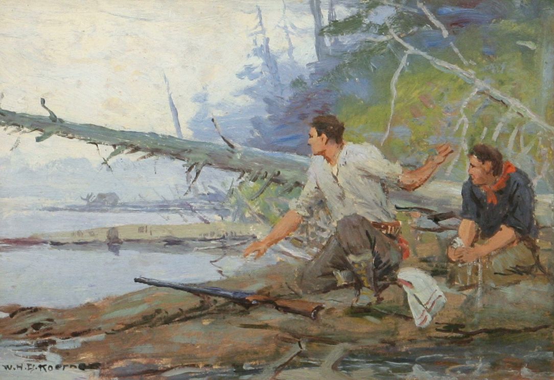 W. H. D. Koerner (1878-1938). Hunters / Fallen Log / Moose. 7" x 10" oil on board. Signed lower left: W. H. D. Koerner. W. H. D. KOERNER 1878-1938 stamp verso #B-9. Condition reports can be viewed at www.marchinmontana.com/docs/2013CR.pdf