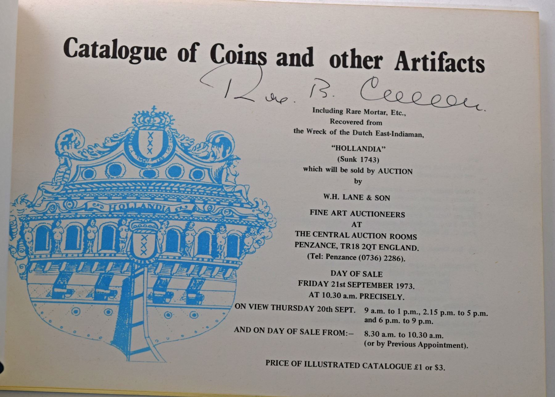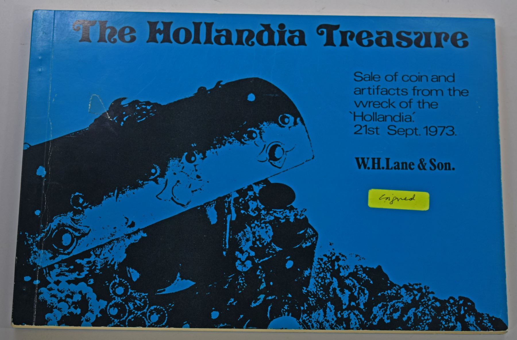W.H. Lane & Son. (Signed) THE HOLLANDIA TREASURE. September 21, 1973. 4to, 76 pages; Softcover; Signed by the Salvor Rex B Cowan; Ex Sedwick Treasure Auction #6 Lot 2047; This auction catalog details 804 lots of coins (ducatons and pillar dollars) 16 lots of artifacts and a Dutch bronze mortar from the “Hollandia”, a Dutch East Indiaman which was wrecked in 1743 in the Scilly Islands. There is a description of the wreck and salvage, and a history of the pillar dollar. Subject: History - Sunken Treasure