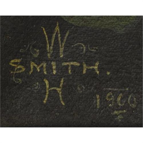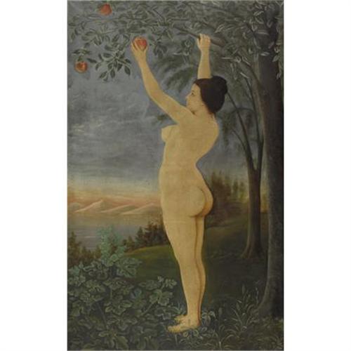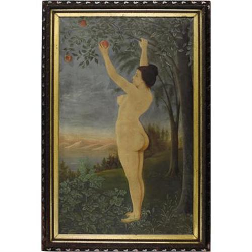 <B>W. H. SMITH </B></I>(America, active in Tennessee circa 1900)<BR><I>Eve</B></I>, 1900<BR>Oil on canvas<BR>88 x 54 inches (223.5 x 137.2 cm)<BR>Signed and dated lower left: <I>W. H. Smith / 1900</B></I><BR><BR>Accompanied by a framed period photographic portrait of the self-taught Tennessee artist.<BR> <B>Condition Report:</B> Back of canvas has been reinforced with black/brown matte paint, scattered spots of mold, craquelure, and surface dirt.<BR><BR><b>Shipping:</b> Requires 3rd Party Shipping (<a target="_blank" href="http://www.heritageauctions.com/common/shipping.php">view shipping information</a>