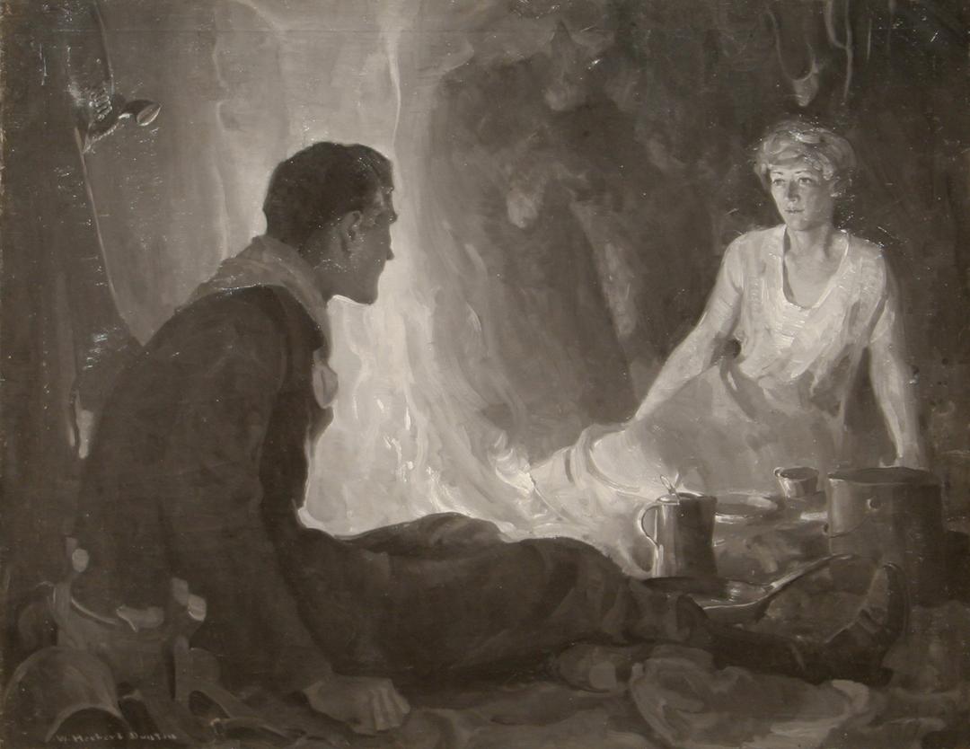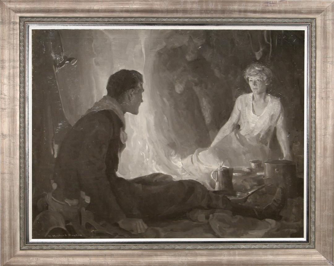 W. Herbert Dunton (1878-1936). Adam's Campfire. 34" x 41" oil on canvas (en grisaille). Signed lower left. (est $20,000-30,000). Provenance: Ex-Harmsen Collection, Denver, Colorado. Literature: Illustration for Zane Grey's story The Wanderer of the Wasteland in McClure's Magazine, Volume 52, Number 10, November 1920 (page 30). A photocopy of page 30 is attached verso. For condition reports please visit: www.auctioninsantafe.com/cr2011.pdf