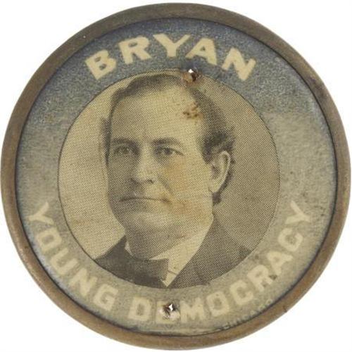 <B>W.J. Bryan Young Democracy Celluloid.</B></I> 1 3/4" pin supporting Bryan with portrait of candidate set in a navy field. Good condition exhibiting some fading; pin has been removed from back. <I>From the Norman Loewenstern Collection.</B></I><BR><BR><b>Shipping:</b> Miscellaneous Collectibles, Smal (<a target="_blank" href="http://www.heritageauctions.com/common/shipping.php">view shipping information</a>)