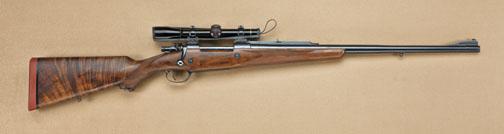 W. J. Jeffery, London, big-game bolt-action sporting rifle on Mauser action, in .404 express caliber. Serial #28116 on barrel. Shows quick detachable mounts with Leopold 3-power scope. The barrel shows an African type rib with iron sights, and the rifle is nicely stocked in select grained walnut with a hard-rubber recoil pad, and the floorplate is engraved “404 nitro rimless” with serial “28116”. The rifle shows a premium restoration and restocking by a master gunsmith, possibly English done. The rifle retains 98-99%. The satin finish walnut stocks are excellent as replaced, and the rifle shows QD sling swivel eyelets. The rifle measures 13-3/4” to the end of the wood, 14-3/4” to the end of the hard-rubber old-English recoil pad. The action is good, the bore is very good. From the Robert Petersen Collection. Est: $3,000 - $6,000