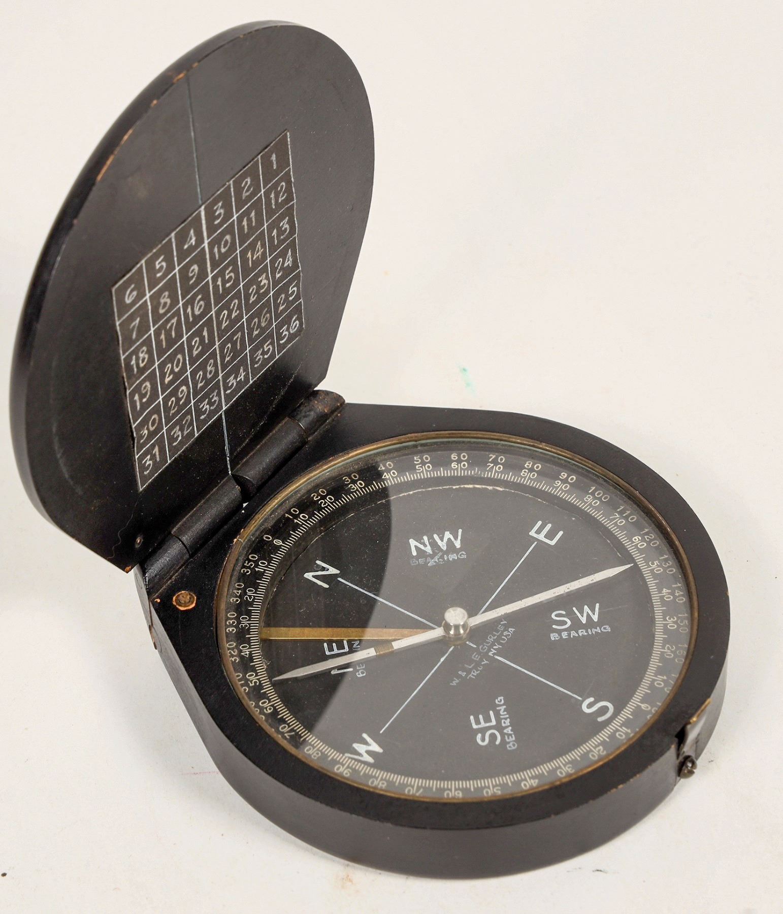 This is a Gurley surveyor's compass mounted in a wood case. In beautiful condition. All numbers and letters are hand painted. Black background with needle stop. C. 1900 or earlier. From the Popovich collection. Please see photo for details.