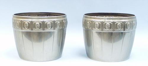 W.M.F. - A pair of hammered silver patinated jardinieres with stylized flower decoration. Fully hallmarked underside. 11 1/2" diameter, 10" high. Circa 1900.