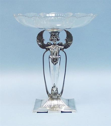 W.M.F. - An early 20th century silver plated centrepiece in form of a winged bust supporting an etched glass tazza. With impressed mark and numbered 225. 14" high.