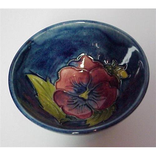 Lovely vintage Moorcroft open salt cellar with - Beautiful colors and design,my fovorite PANSY, please see our images - Measures 3 1/2" in diam. and about 1 3/4" high - lOVE THE SHAPE OF THIS DISH!, Excellent condition - Free of damage but for some glaze crazing which is very common to this pottery - US Buyer please pay 6.00 for shipping + insce. - Thank You very much for looking!