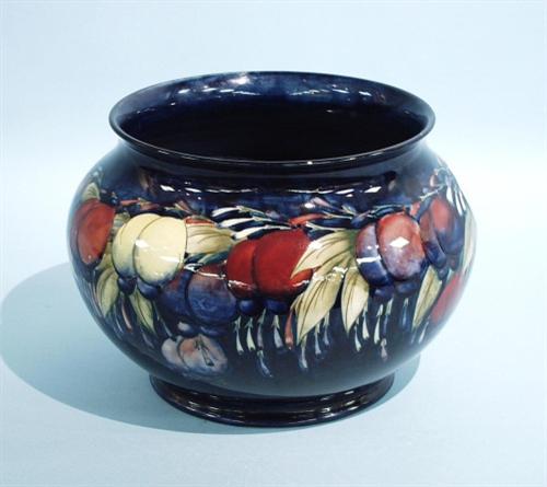 W. MOORECROFT - "Wisteria". A very good flambe glazed vase of baluster form, hand painted with flowers and leaves on a blue ground. Fully marked. Top 9" diameter, 8" high. Circa 1928.