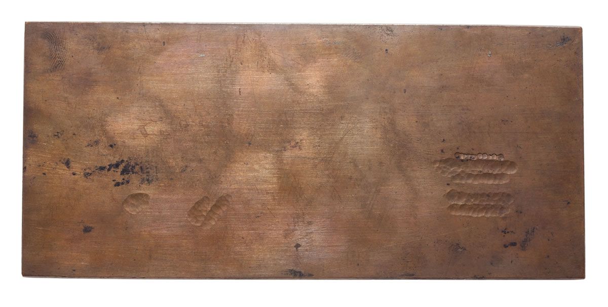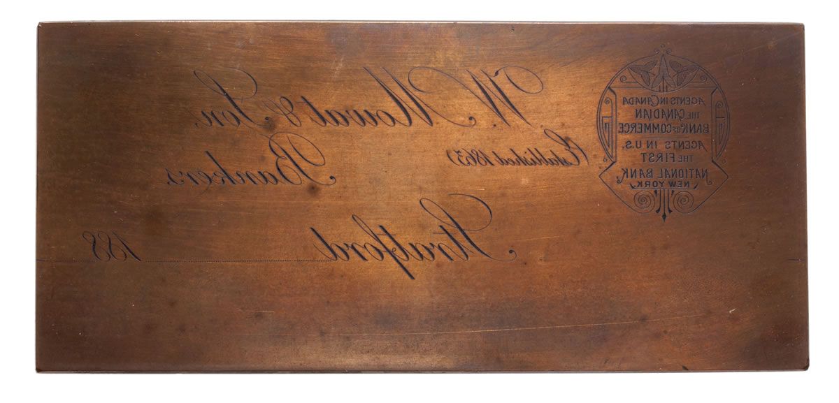 188_. A small mirror image copper printing plate for a small business card. "Agents in Canada for the Canadian Bank of Commerce". "Established 1865". Red-brown patina. 2.5" x 5.5". Mowat & Sons are listed in Charlton (page 562) as private Ontario bankers.