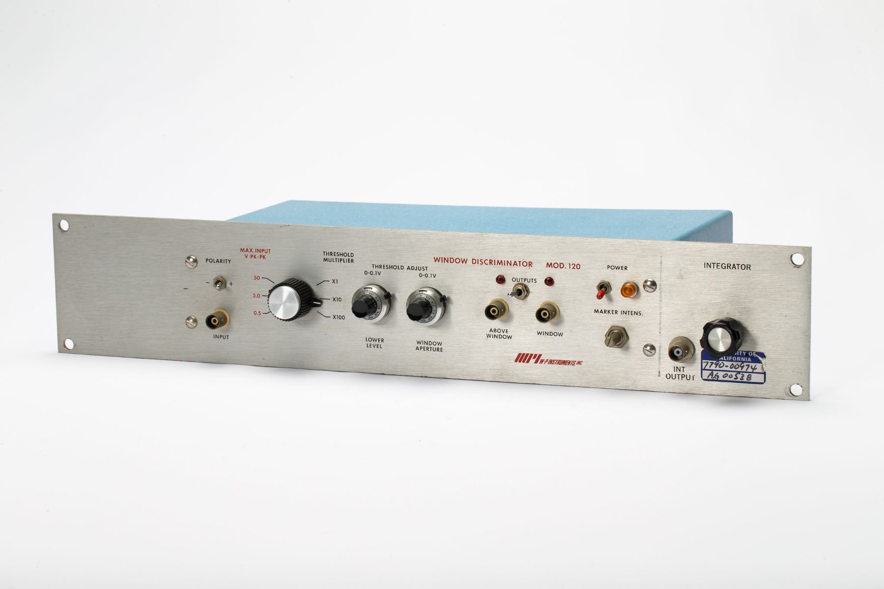 Window discriminator panel useful for nuclear and photon counting, manufactured by W-P Instruments of New Haven, Connecticut, measuring 19? x 3.5? x 7?, identified as "Model 120, Serial 346." In fine condition.