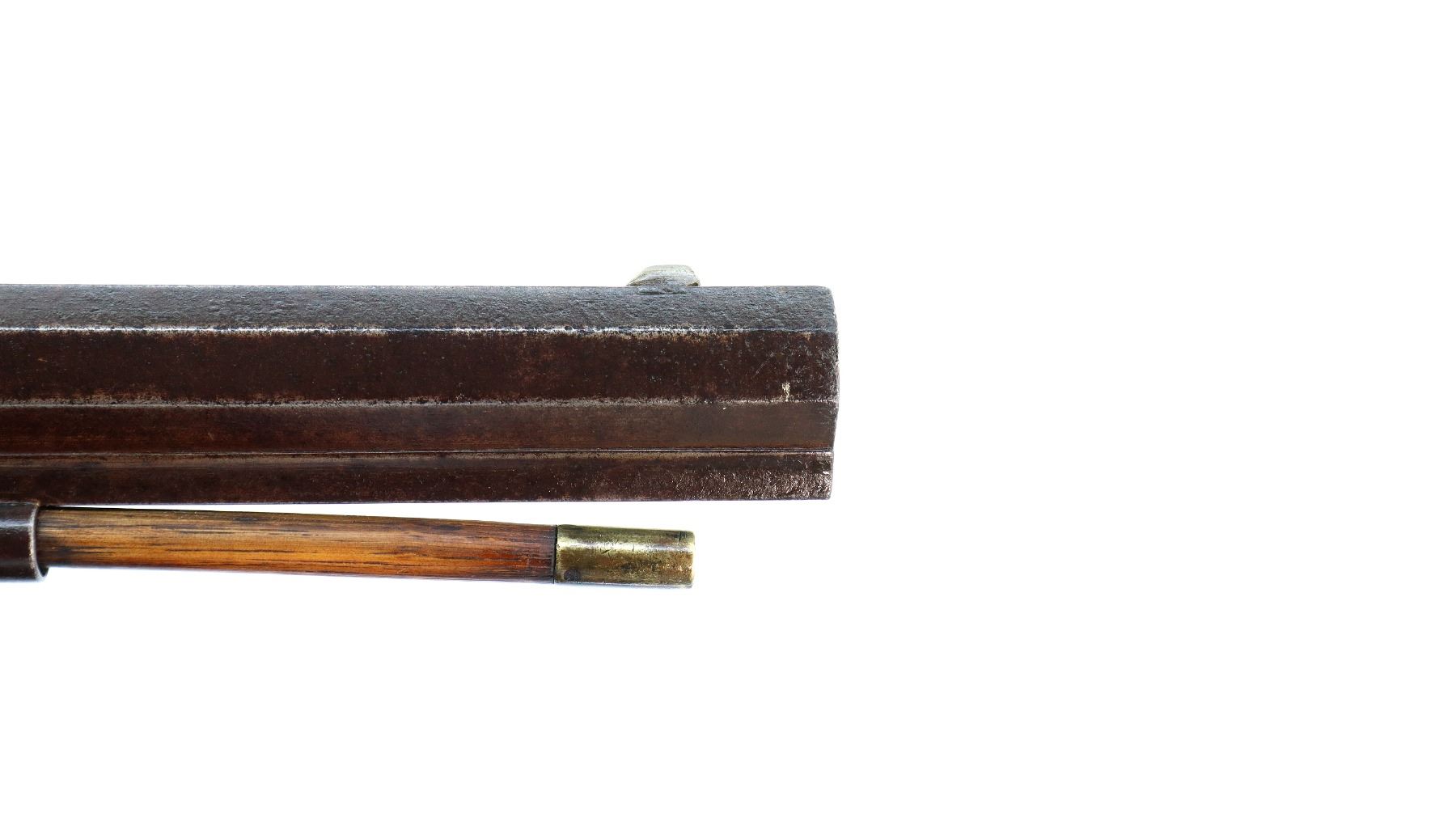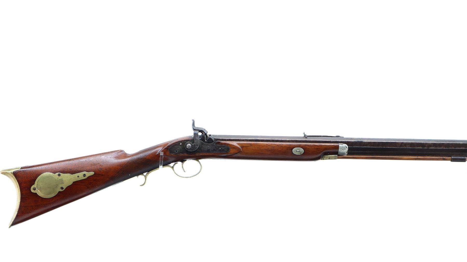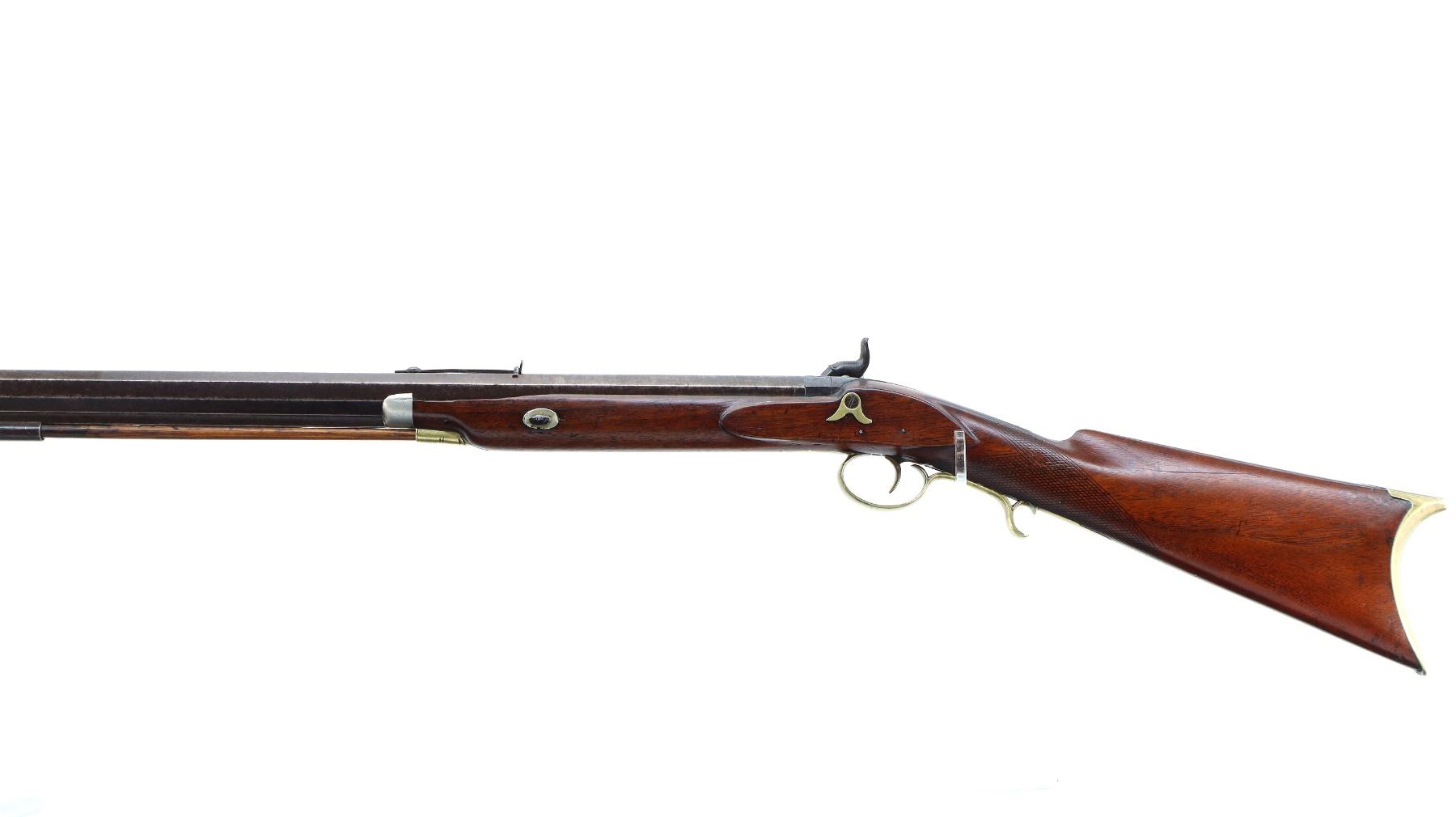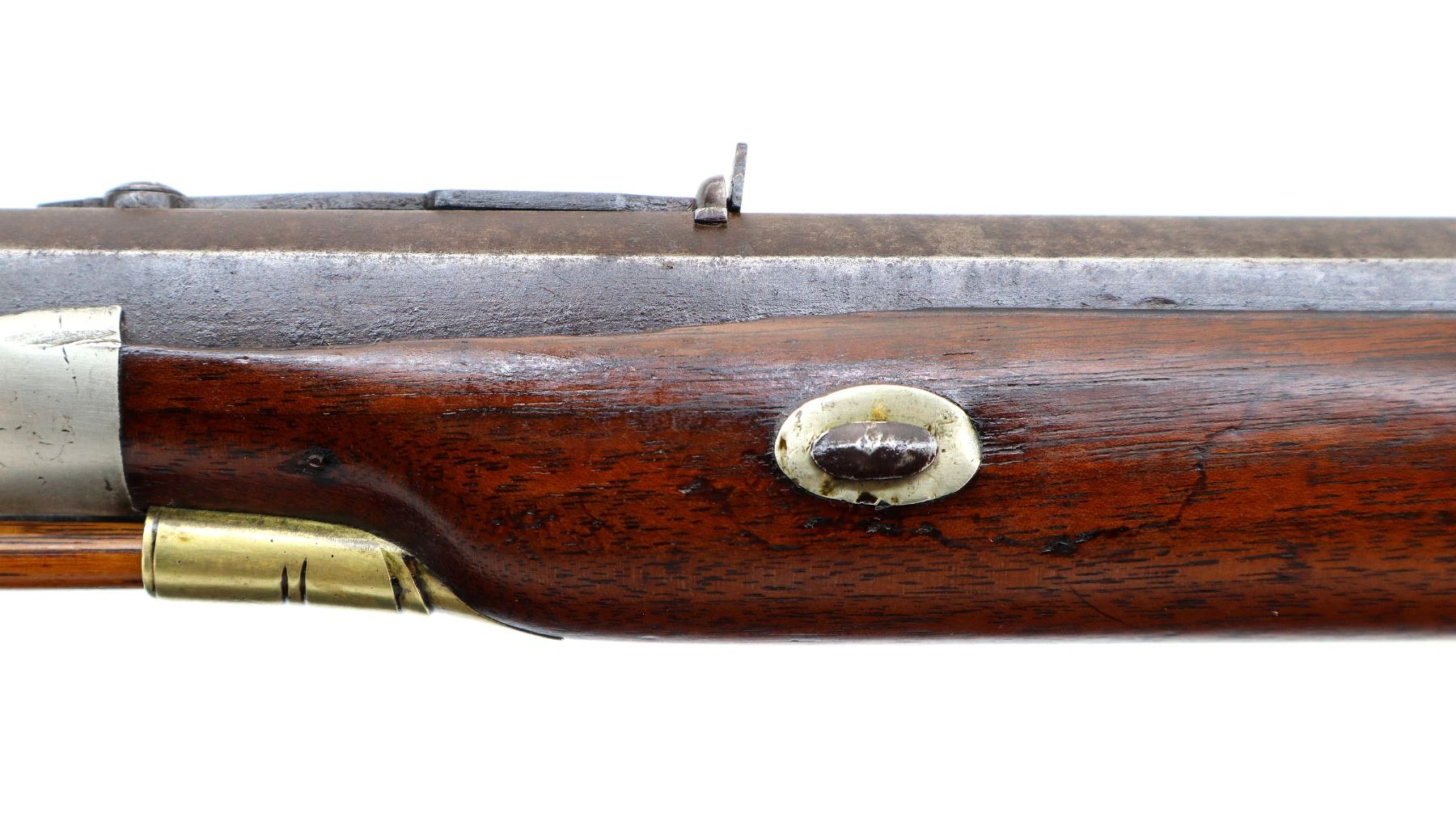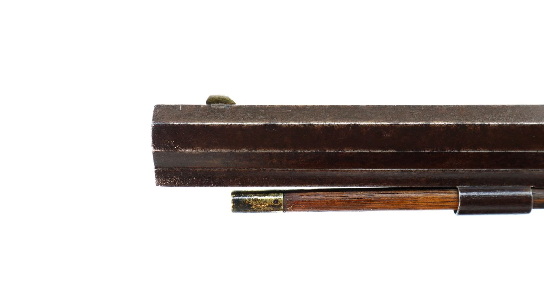 Main Description: Blade front sight, u notched rear sight missing elevator, heavy octagon barrel, engraved lock with checkered spur hammer, mainspring is light, nipple is intact. One piece half length wood stock, single forend wedge, forearm is chipped, checkered straight grip, smooth curved brass butt plate, patch box, finger rest trigger guard. Alloy nose cap, wood ramrod with brass tip.