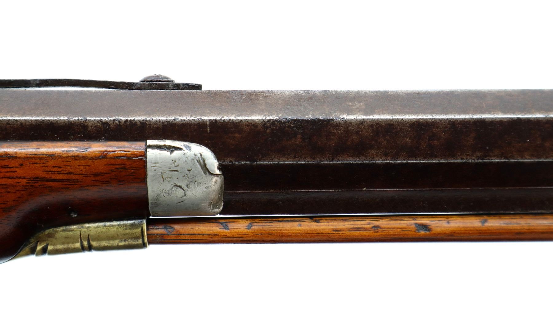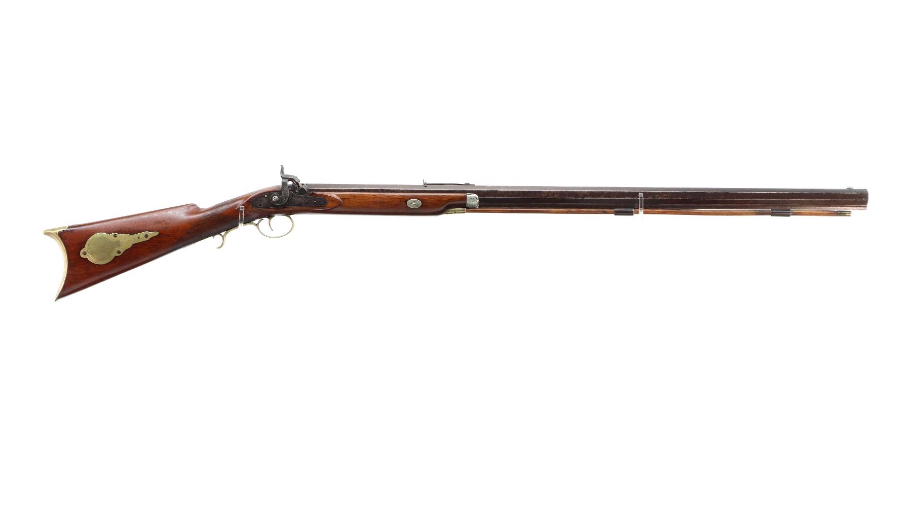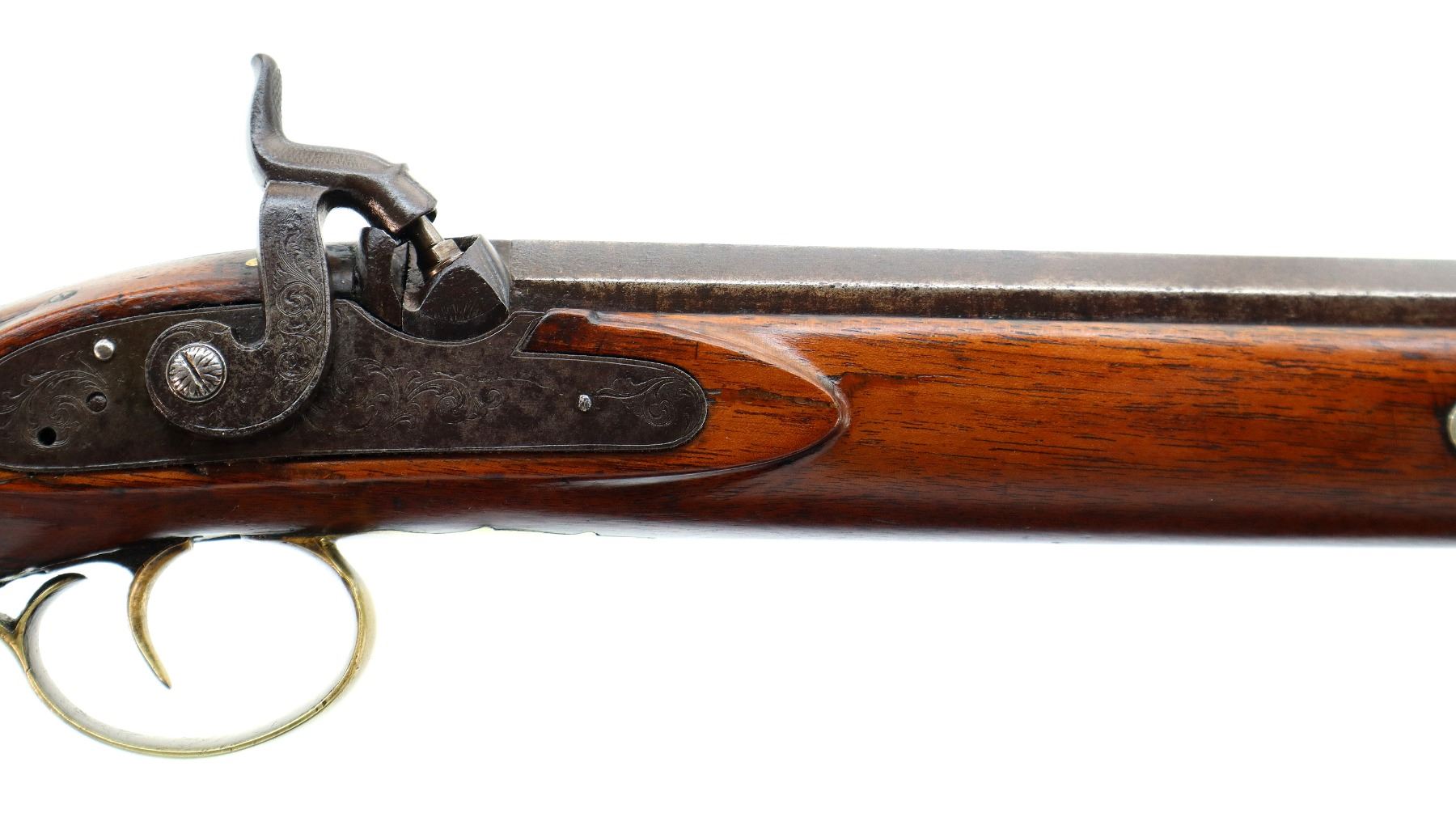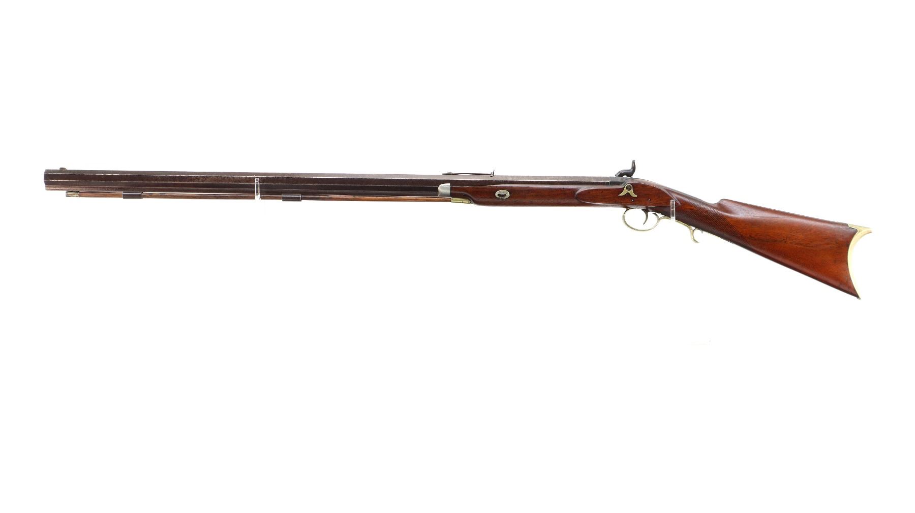 Main Description: Blade front sight, u notched rear sight missing elevator, heavy octagon barrel, engraved lock with checkered spur hammer, mainspring is light, nipple is intact. One piece half length wood stock, single forend wedge, forearm is chipped, checkered straight grip, smooth curved brass butt plate, patch box, finger rest trigger guard. Alloy nose cap, wood ramrod with brass tip.