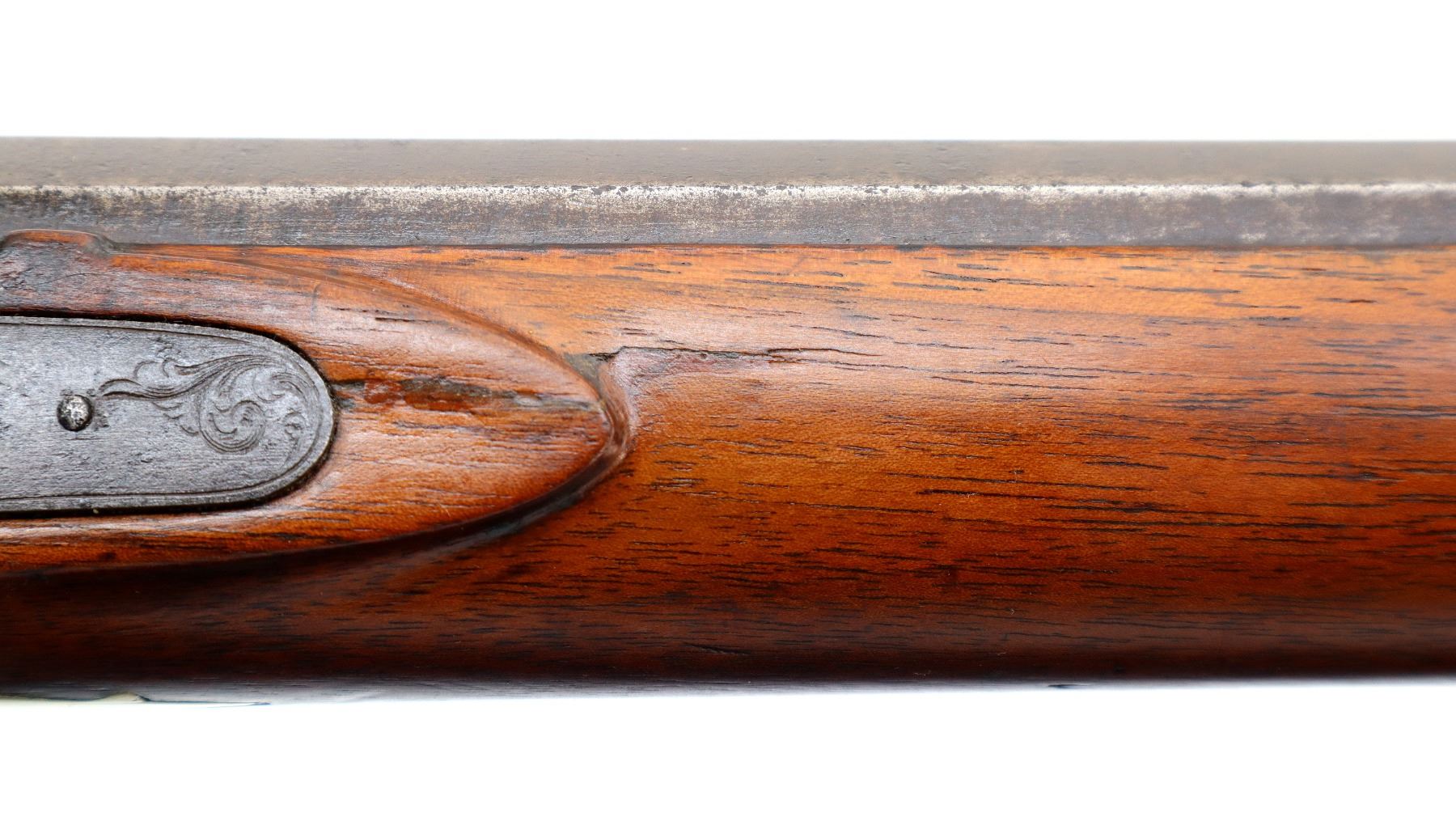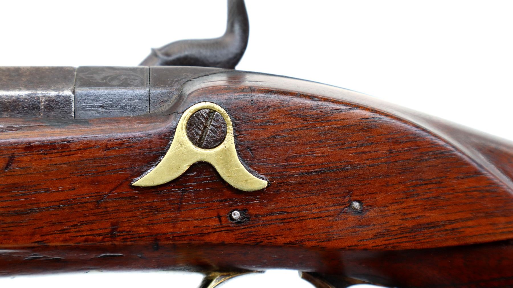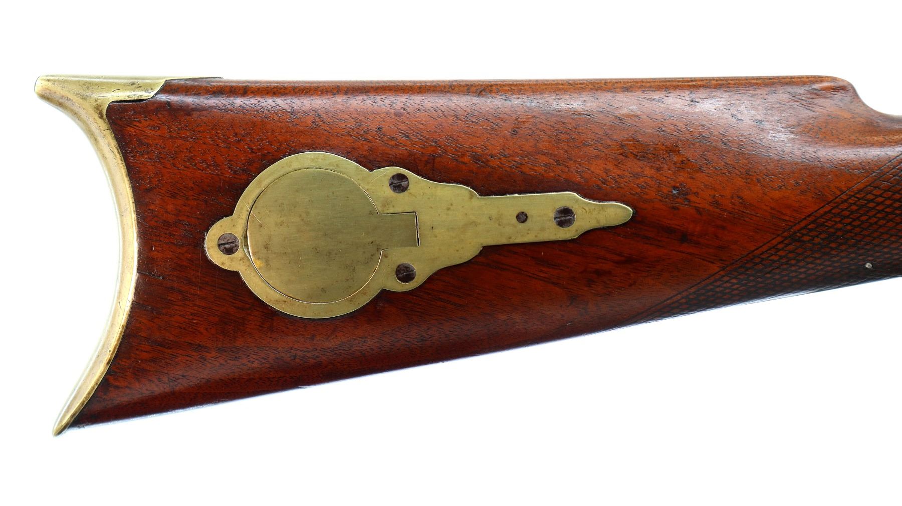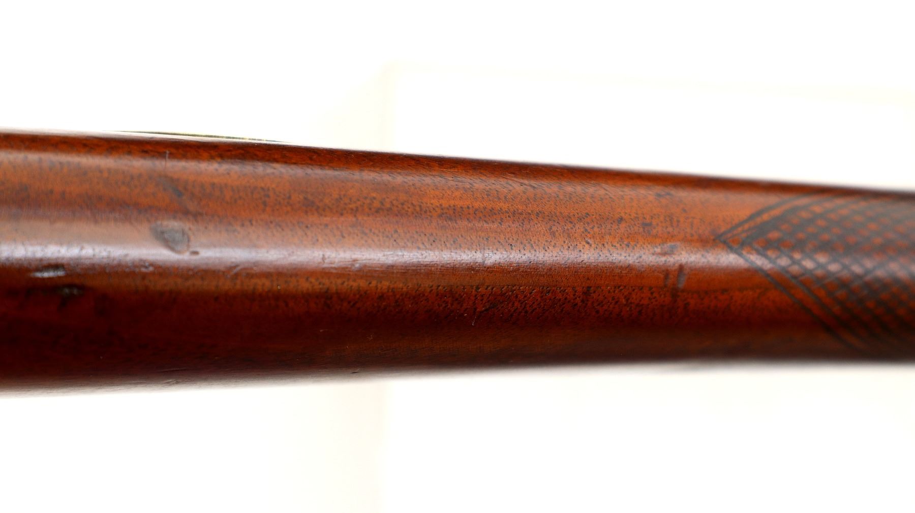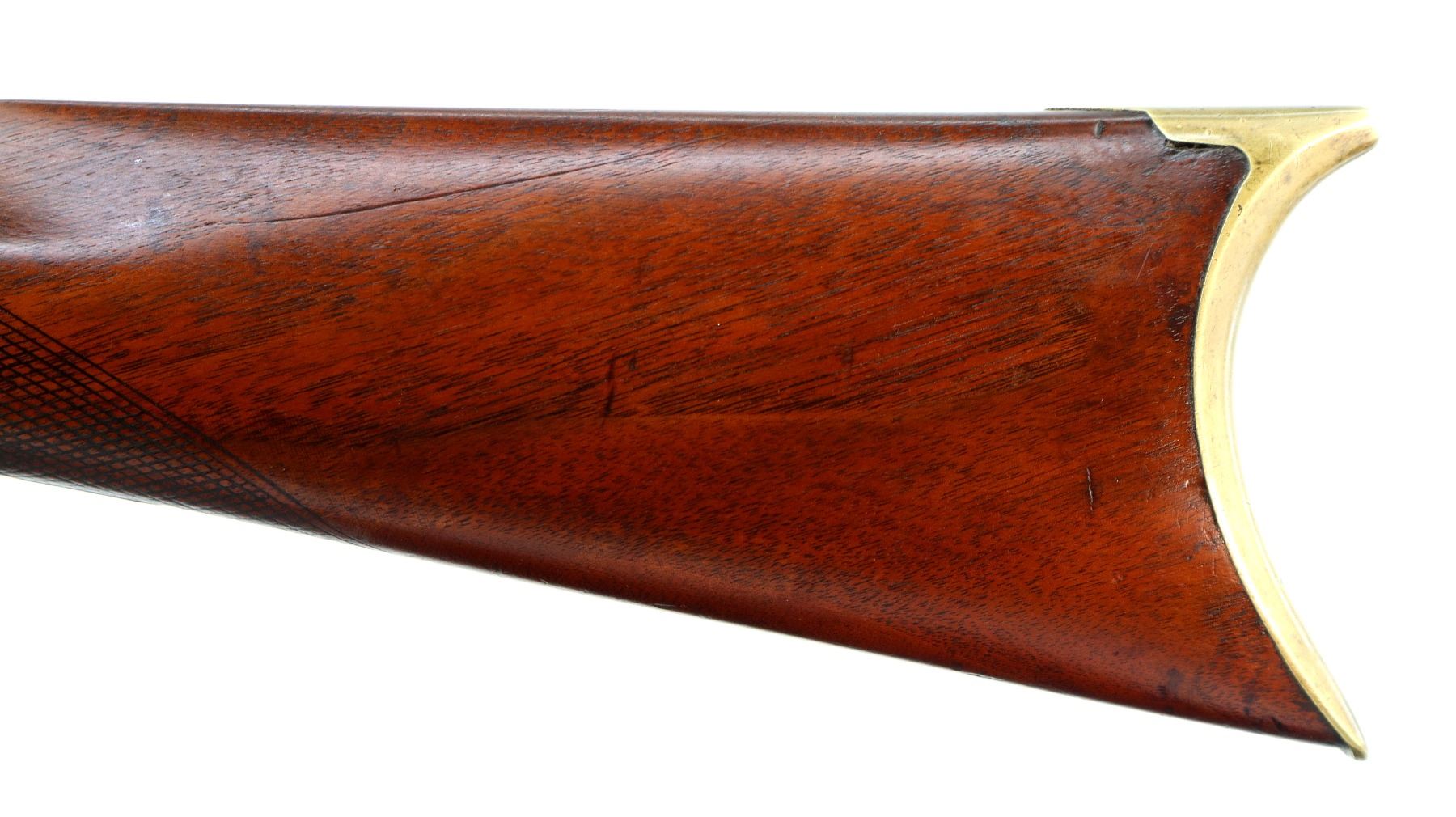 Main Description: Blade front sight, u notched rear sight missing elevator, heavy octagon barrel, engraved lock with checkered spur hammer, mainspring is light, nipple is intact. One piece half length wood stock, single forend wedge, forearm is chipped, checkered straight grip, smooth curved brass butt plate, patch box, finger rest trigger guard. Alloy nose cap, wood ramrod with brass tip.