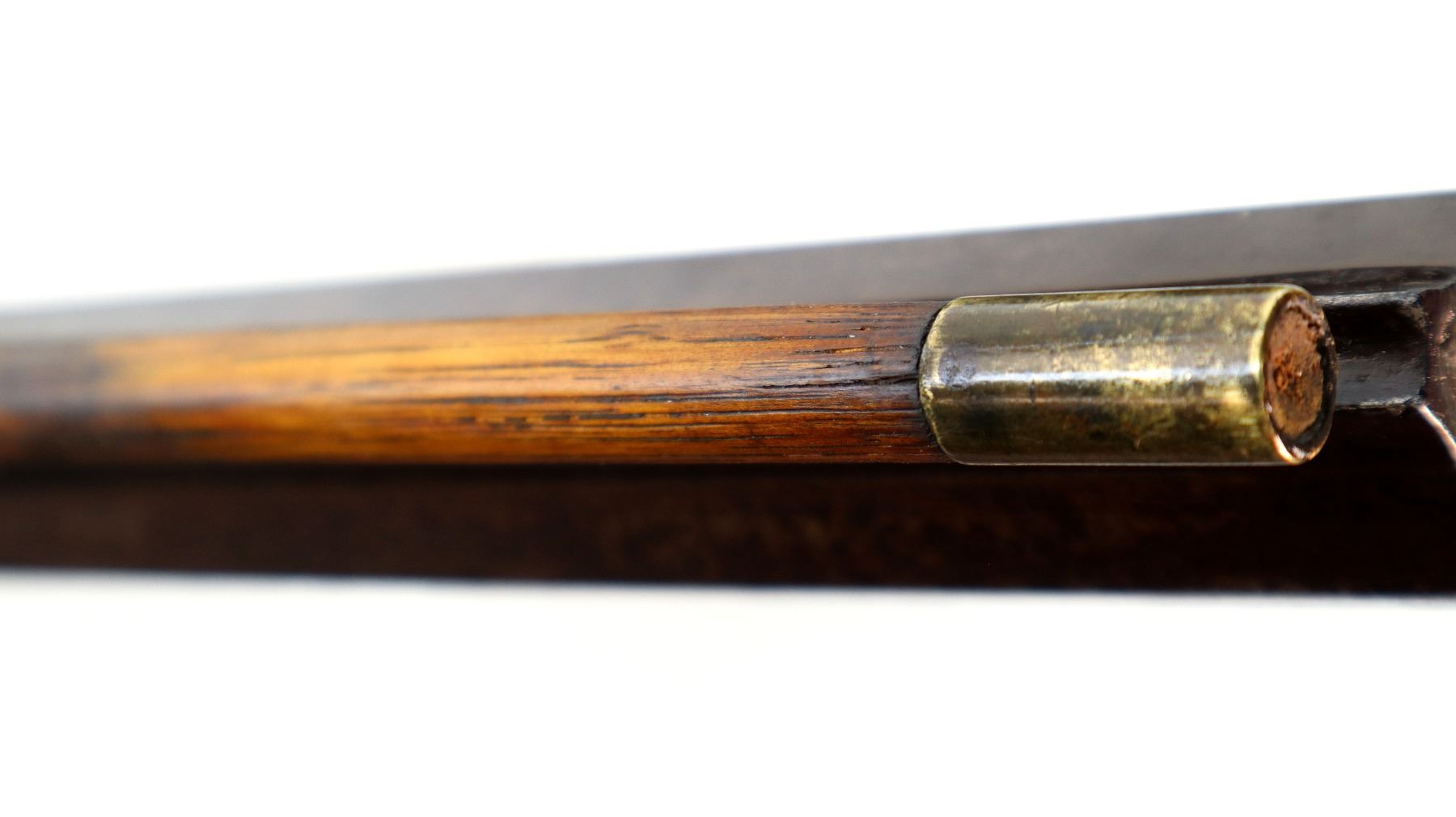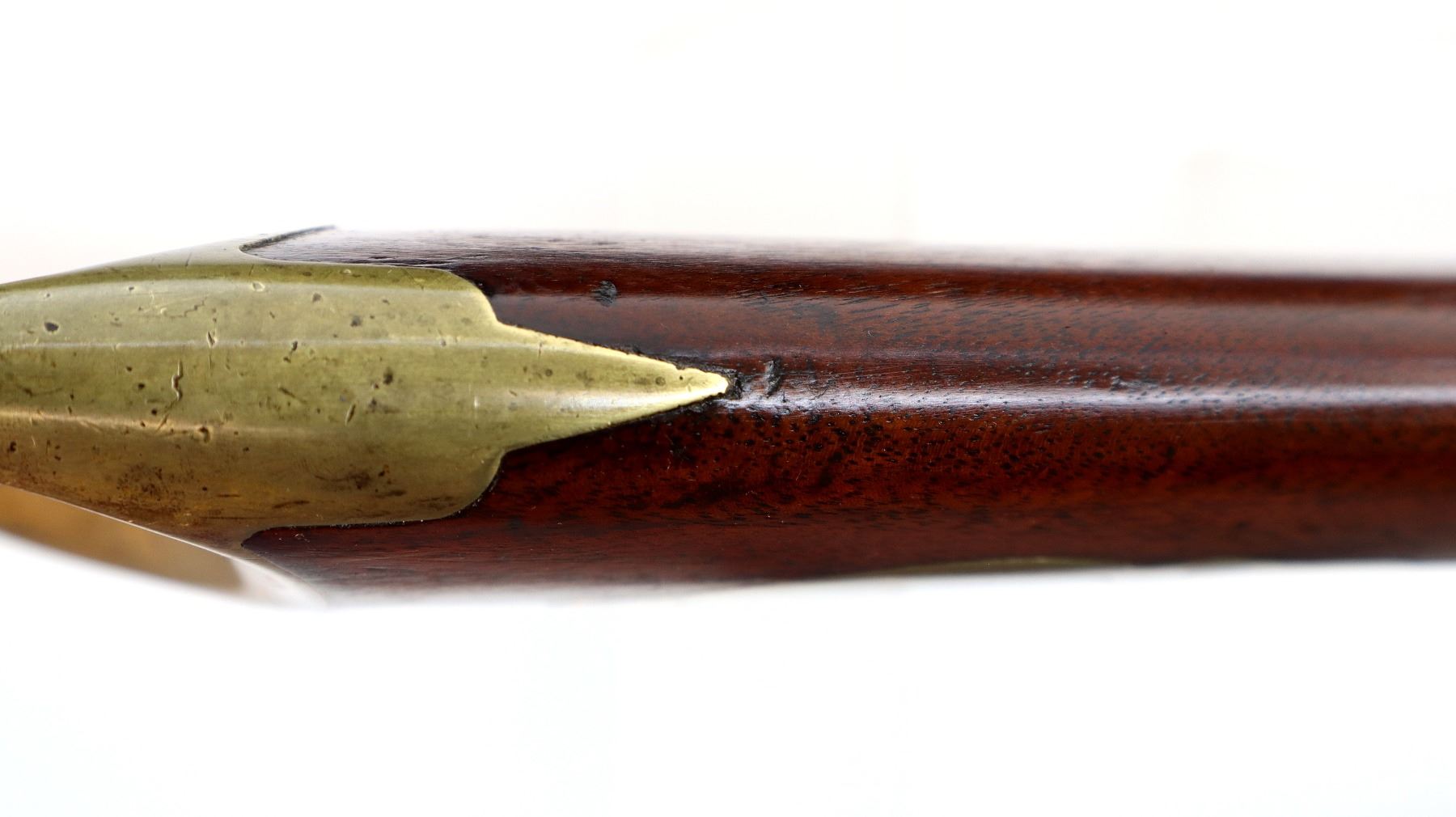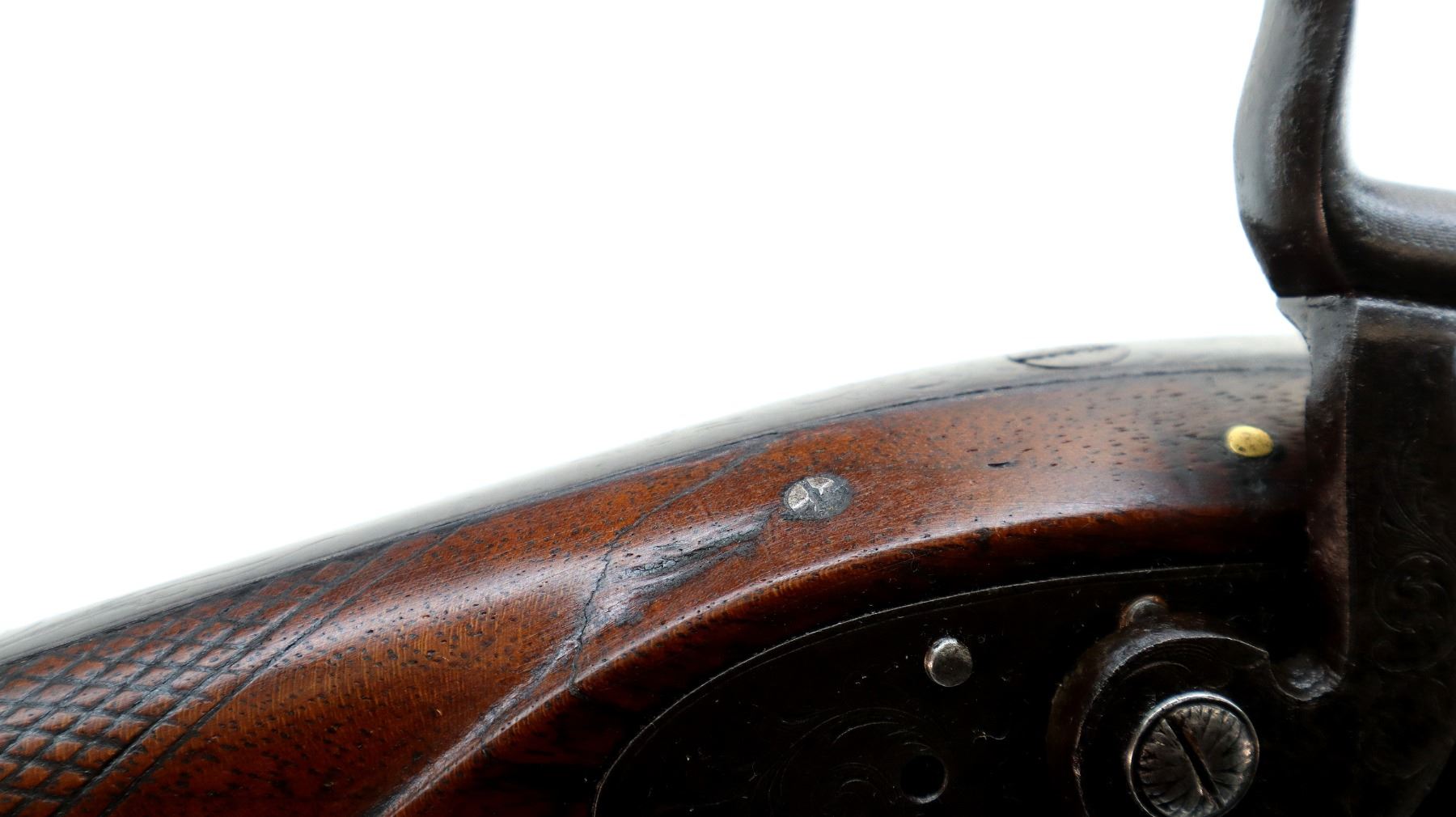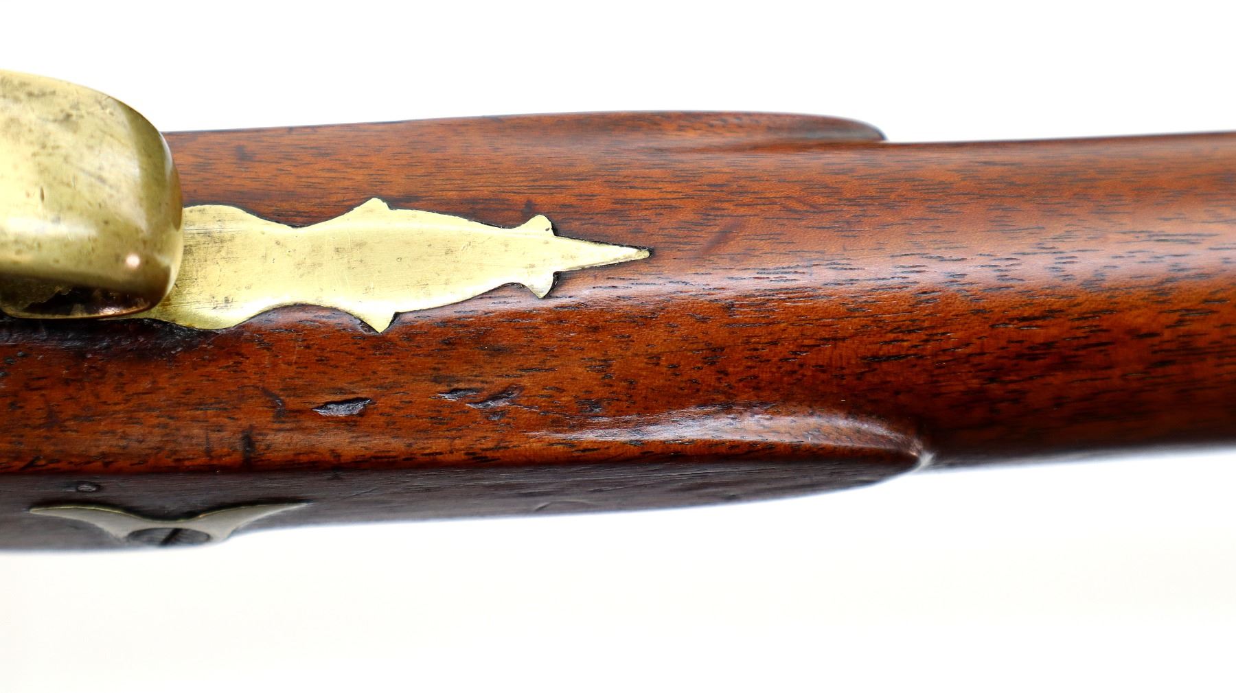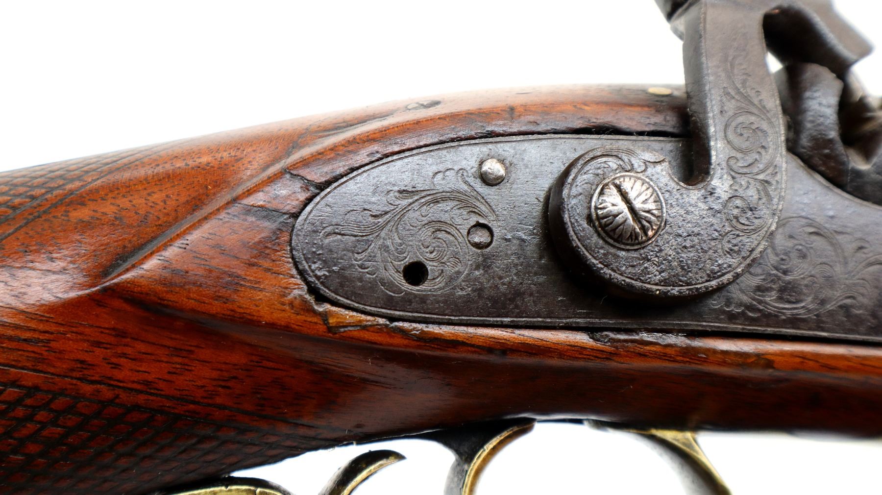 Main Description: Blade front sight, u notched rear sight missing elevator, heavy octagon barrel, engraved lock with checkered spur hammer, mainspring is light, nipple is intact. One piece half length wood stock, single forend wedge, forearm is chipped, checkered straight grip, smooth curved brass butt plate, patch box, finger rest trigger guard. Alloy nose cap, wood ramrod with brass tip.