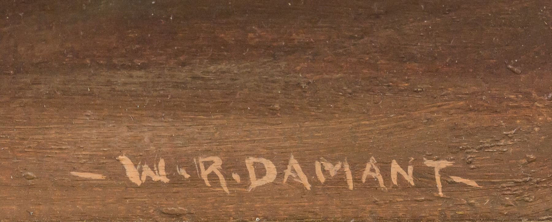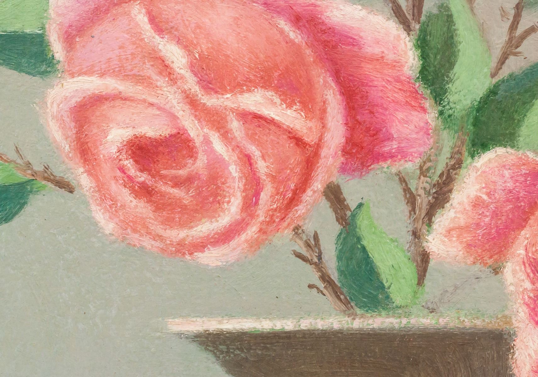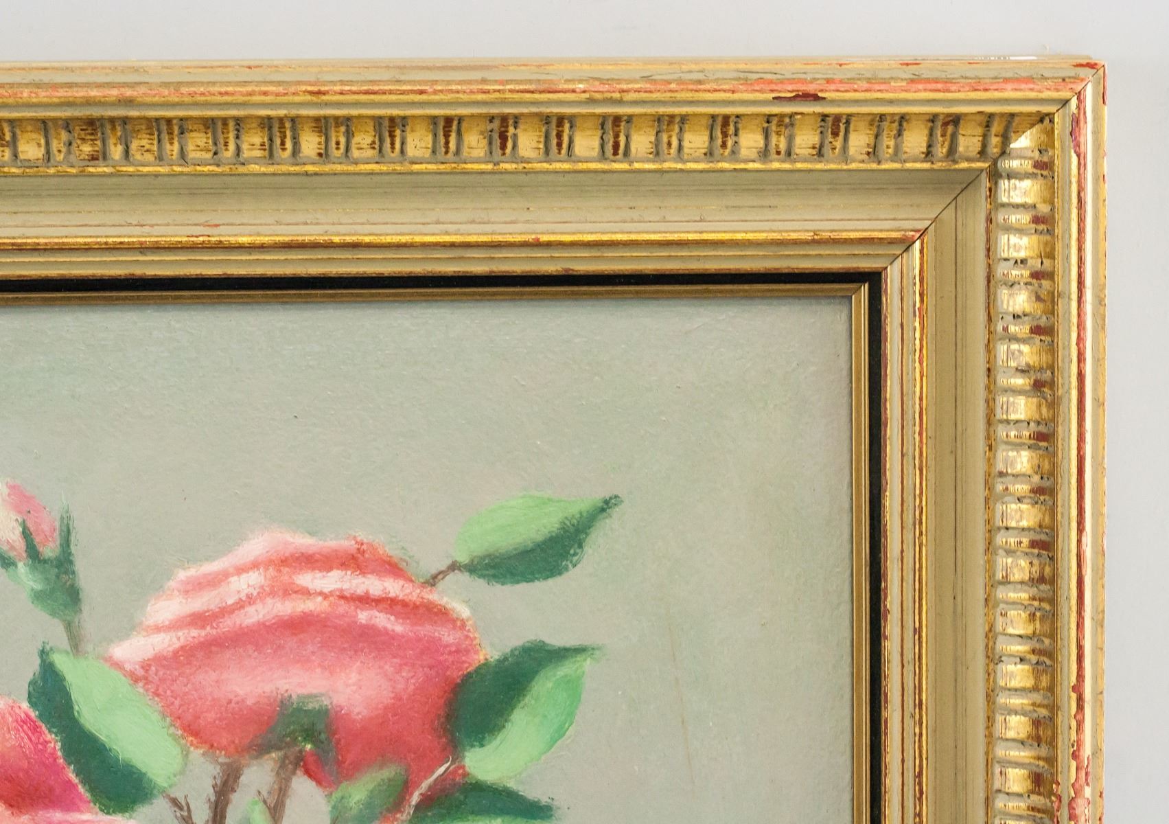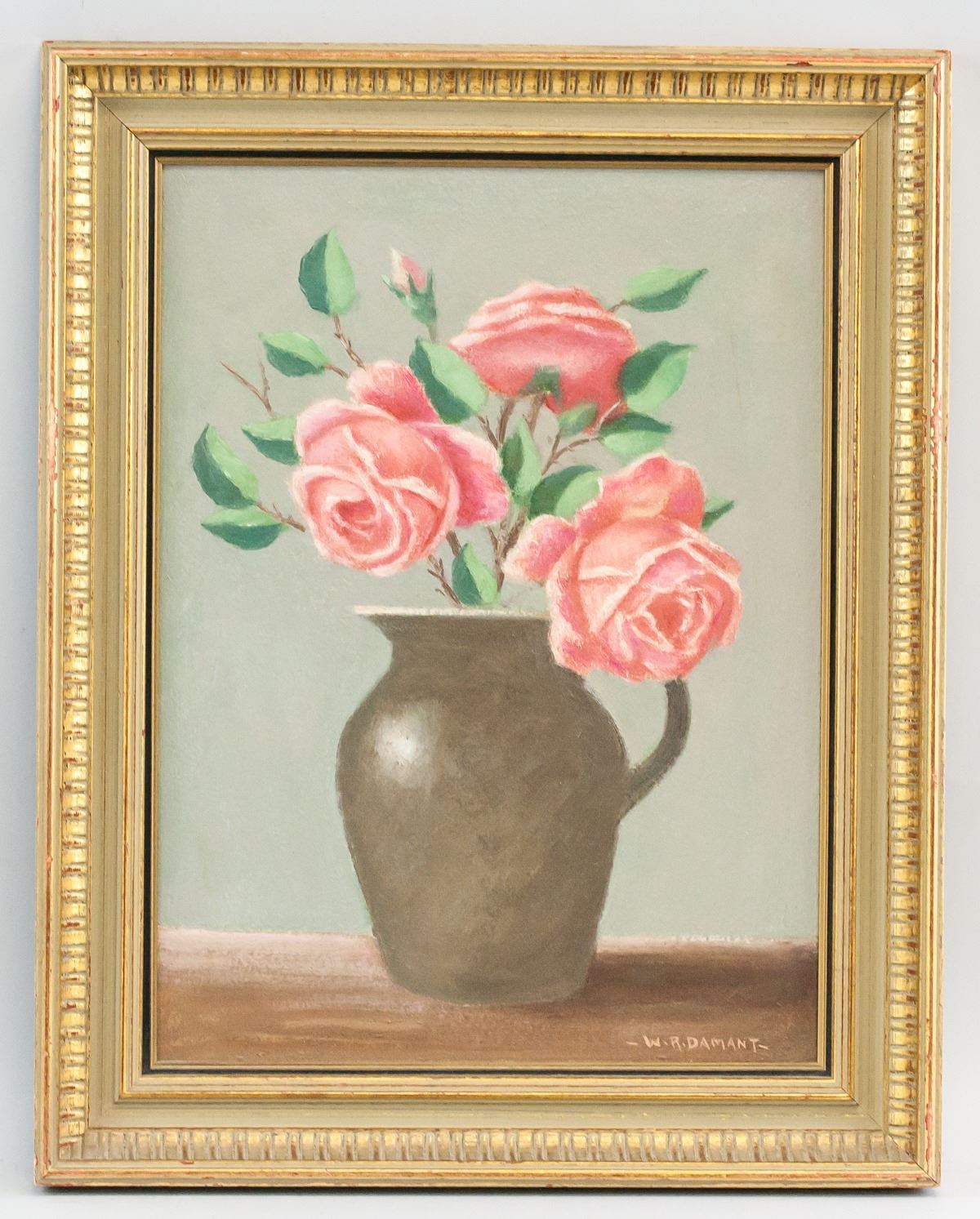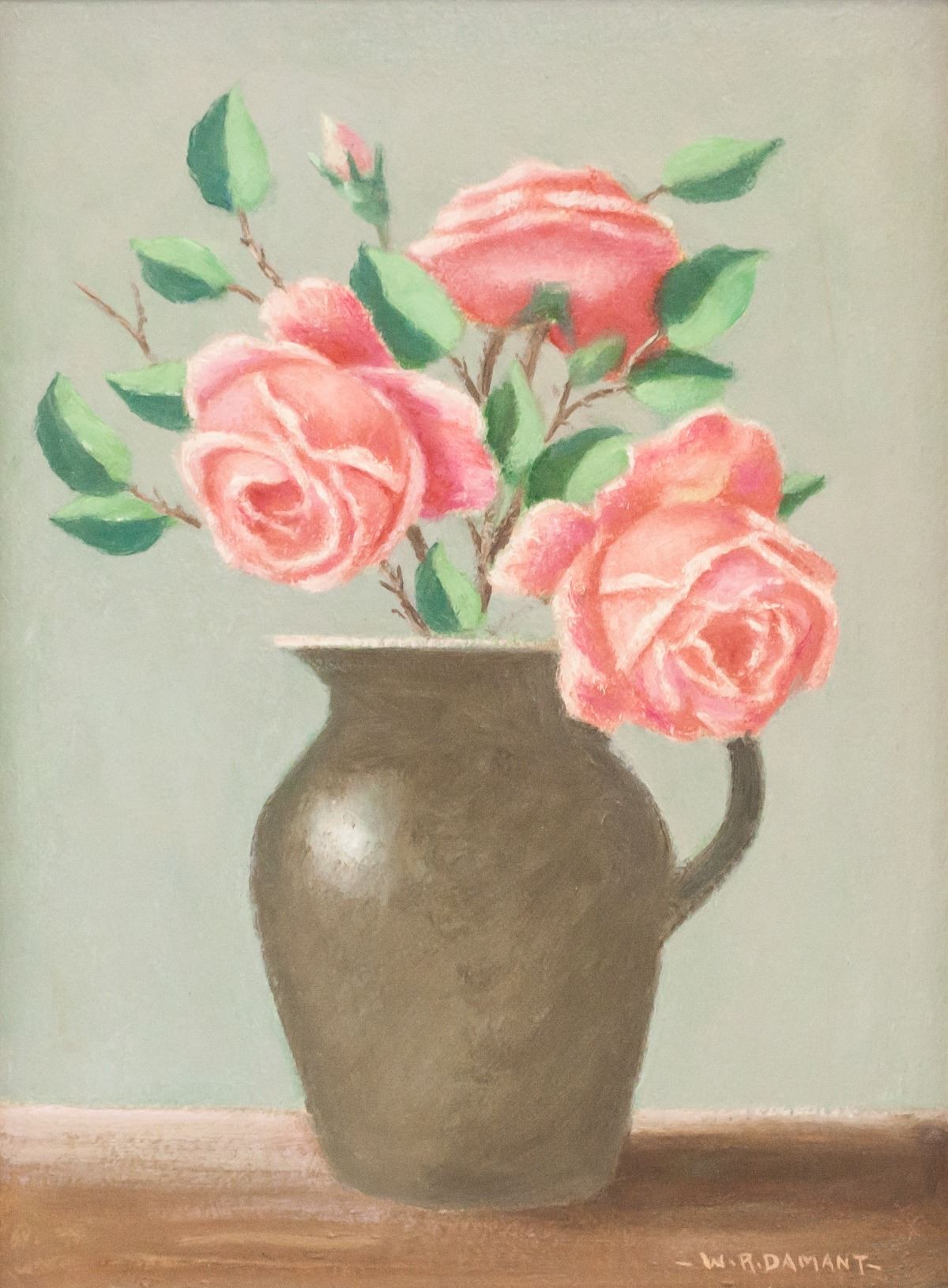 Oil on board, framed. Featuring three roses in a brown jug. Signed "W. R. DAMANT" in the bottom right corner. Attributed to W. R. DAMANT (20th Century, Canadian). 40 x 28 cm (15.75 x 11 in), Frame: 49 x 39 cm (19.3 x 15.35 in).