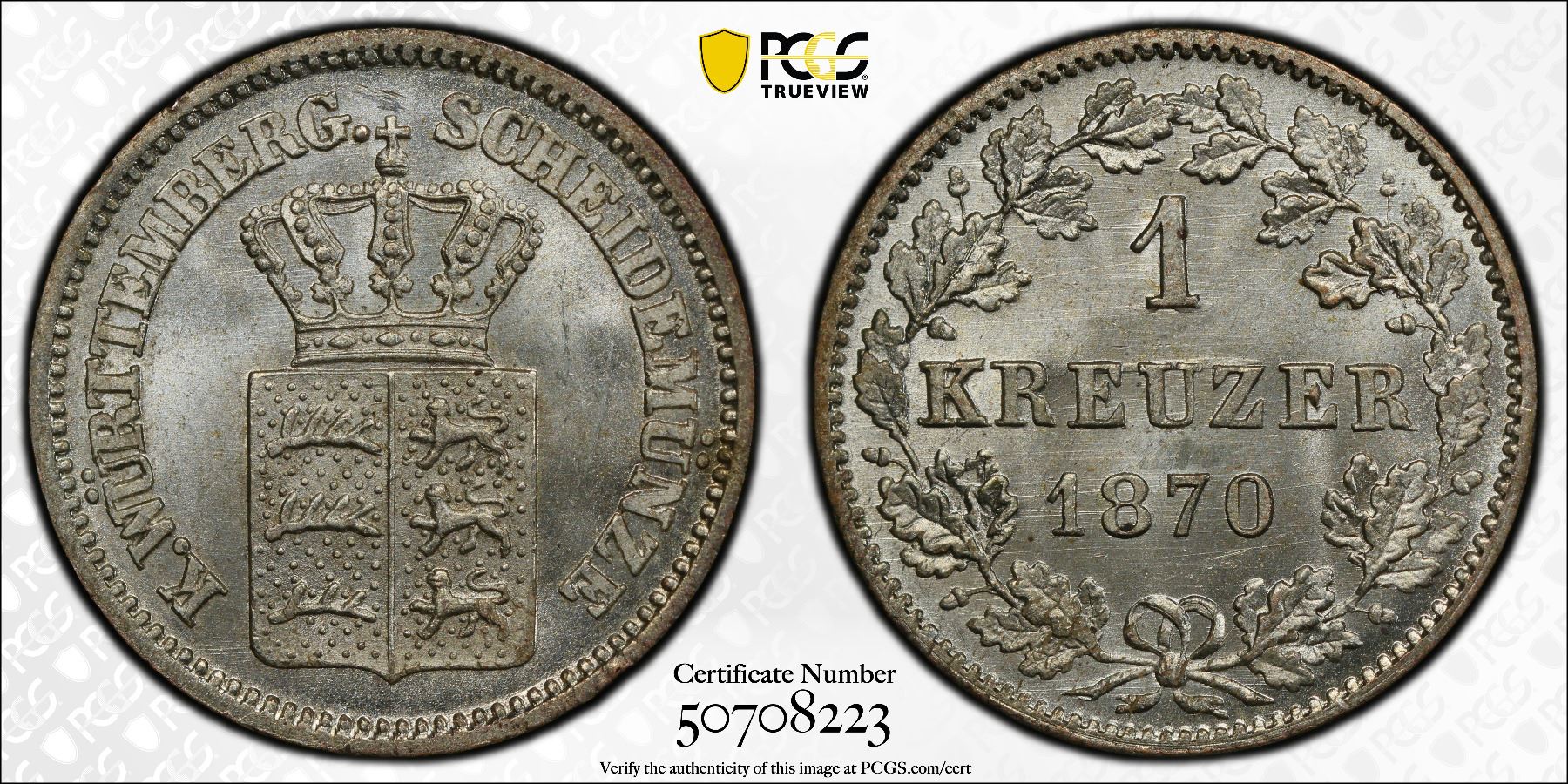 WÜRTTEMBERG: Karl I, 1864-1891, AR kreuzer, 1870, PCGS MS65
