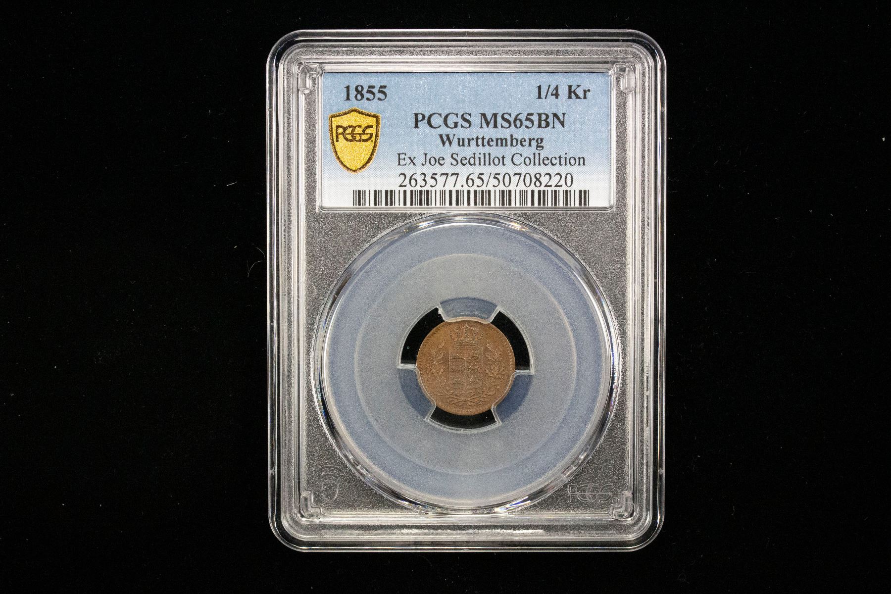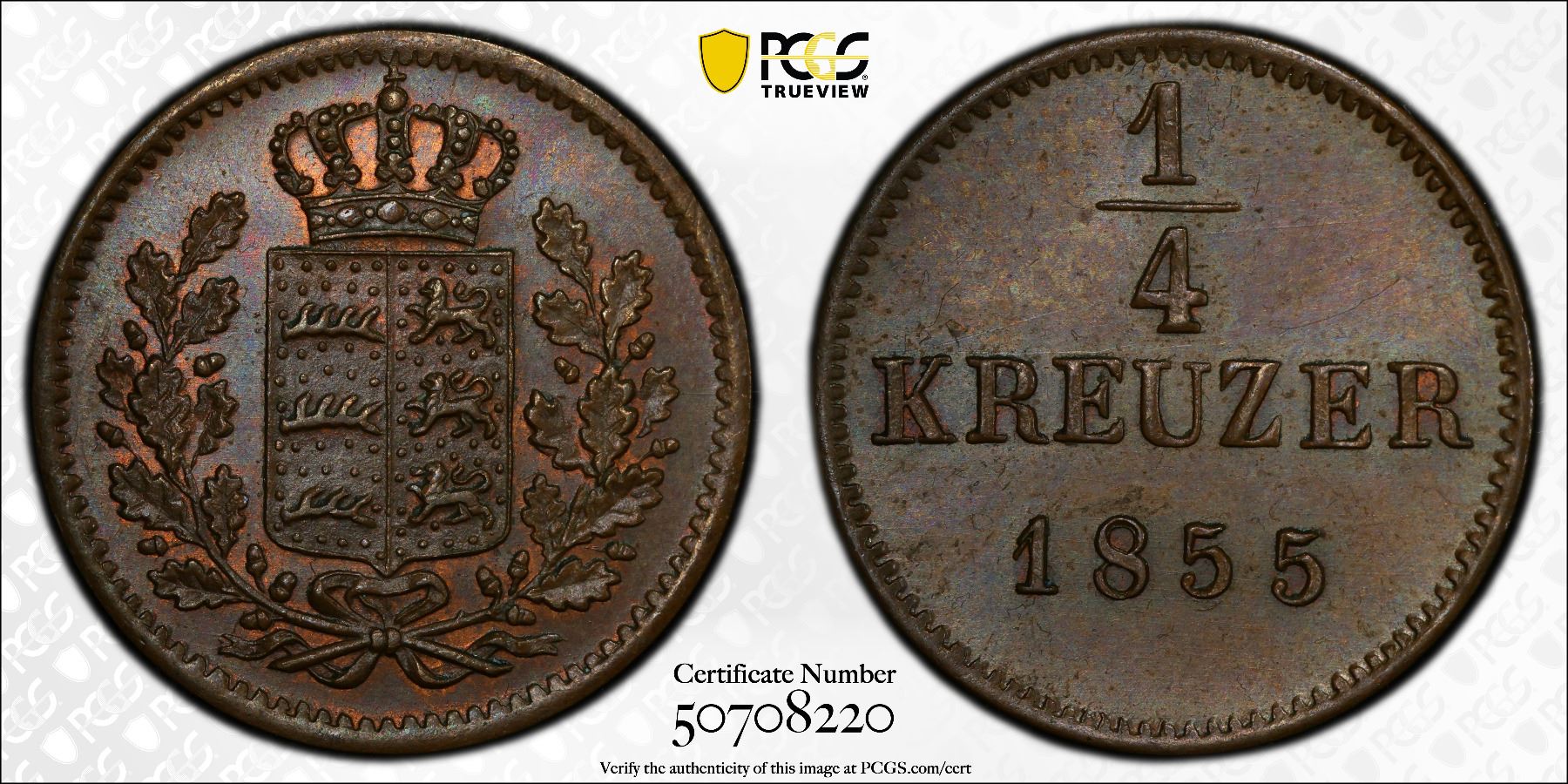 WÜRTTEMBERG: Wilhelm I, 1816-1864, AE 1/4 kreuzer, 1855, PCGS MS65 BN