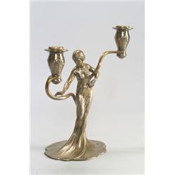 Zinn, versilbert. Zweiarmig, Frauengestalt, zwei Leuchterarme mit Tülle haltend. ein Leuchterarm mit kleinem Riss. H.: 27,3 cm. Bez.: Firmenmarke. Um 1900