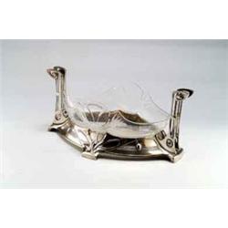 WÜRTTEMBERGISCHE METALLWARENFABRIK, Geislingen Jardinière, Zinn, Glas. Ausschwingende Metallfassung, zu vier Füßen ausgezogen, mit umlaufendem Floral- und Linienrelief, seitlich zwei senkrecht verlaufende, durchbrochen gearbeitete Handhaben mit Voluten. Glaseinsatz mit geschwungenem Rand und geschnittenem Liniendekor. Mod.Nr. 492. Glaseinsatz mit Kalkablagerungen. 19 x 43 x 22 cm. Bez.: Firmenmarke mit Legierungsmarken B, I/O und OX. Um 1900 Lit.: Dry, Graham, Art Nouveau Domestic Metalwork from Württembergische Metallwarenfabrik. The English Catalogue 1906, 2. Aufl., Suffolk 1988, Abb. S. 100, Nr. 492.