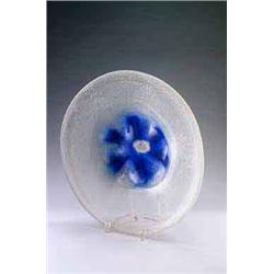 WÜRTTEMBERGISCHE METALLWARENFABRIK, Geislingen Schale Ikora, farbloses Glas. Mit weißen, in der Mitte mit blauen Pulvereinschmelzungen in Sternform, sowie großflächig netzartig angelegten Luftblaseneinschlüssen. Flache Schalenform, in der Mulde fünffach zum Stand hin eingedrückt, Fahne weit ausgezogen. Ø 48 cm. Unbezeichnet. Um 1936 Lit.: Burschel, Carlo, Scheiffele, Heinz, WMF Ikora & Myra Gläser (Serielles Kunsthandwerk und Design im 20. Jahrhundert, Bd. 1), Abb. S. 74 + 152 (zum Vergleich).