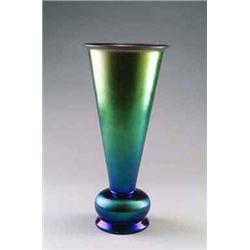 WÜRTTEMBERGISCHE METALLWARENFABRIK, Geislingen Vase Myra, farbloses Glas mit irisierender Deckschicht. Über rundem Stand gedrückt kugeliger Fuß mit sich konisch erweiterndem Gefäßkörper und ausgestellter Lippe. Mod.Nr. J116. H.: 31,5 cm. Unbezeichnet. 1928 Lit.: Burschel, Carlo, Scheiffele, Heinz, WMF Ikora & Myra Gläser (Serielles Kunsthandwerk und Design im 20. Jahrhundert, Bd. 1), Abb. S. 91, Nr. J116