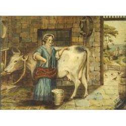W. Raine - Victorian watercolour milkmaid in shed with cow and church in the distance with chickens, 22cm x 28cm