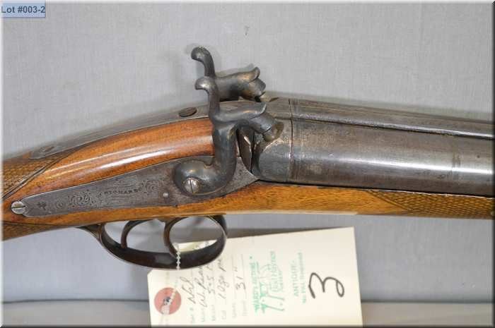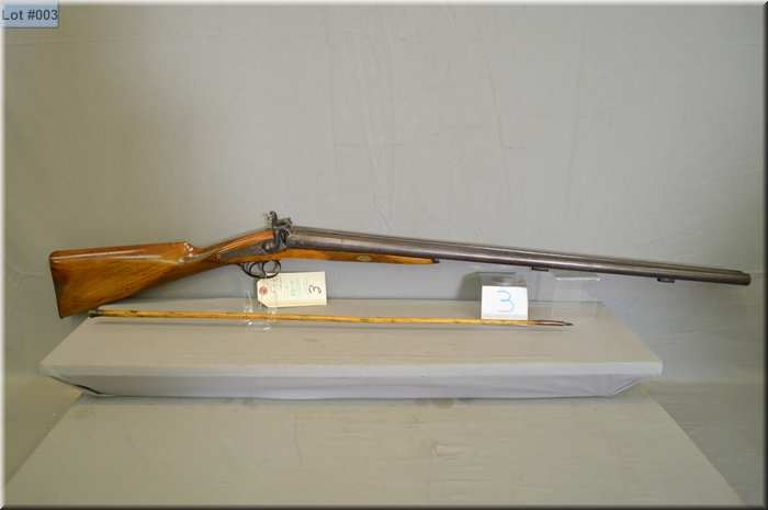 W.Richards Mod Side By Side Hammer .10 Ga Perc Side by Side Shotgun w/ 31 " bbls [ laminated barrels w/ traces of Damascus turned brown, lightly engraved back action style locks w/ hammers, hammers show repair, varnished checkered straight half stock , iron furniture, wooden ramrod ] Ser # Nil ANTIQUE NO PAL REQ