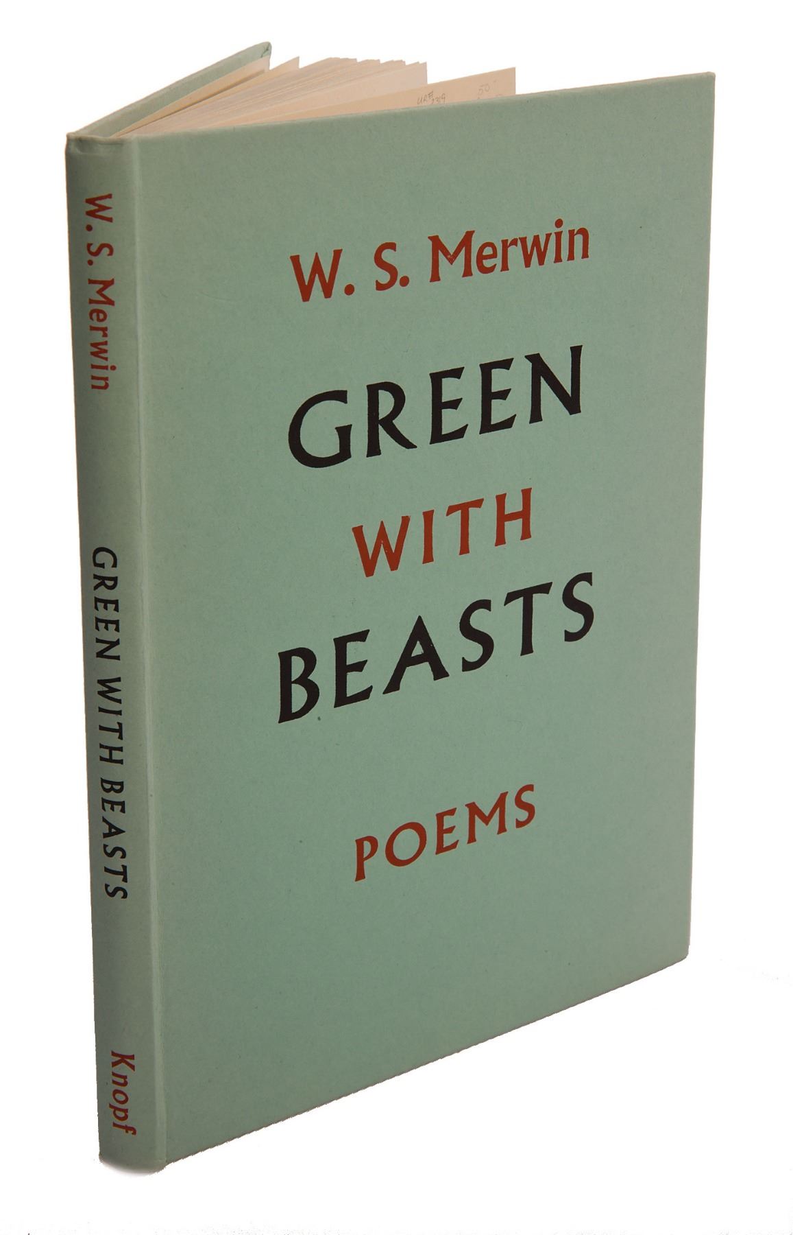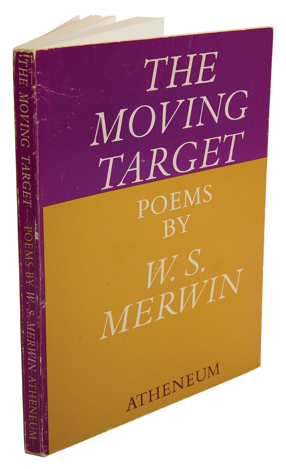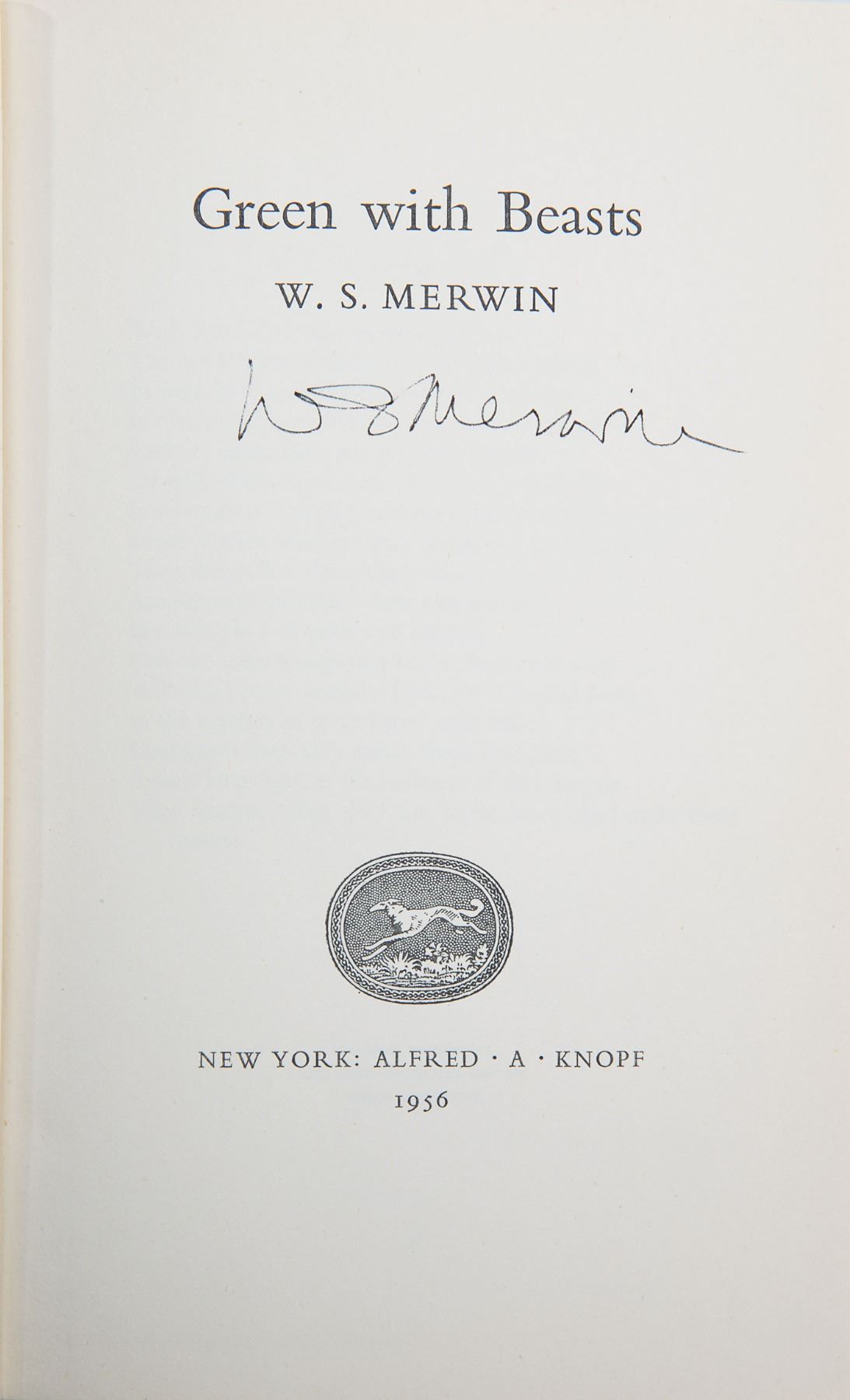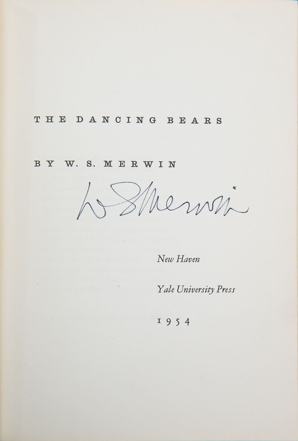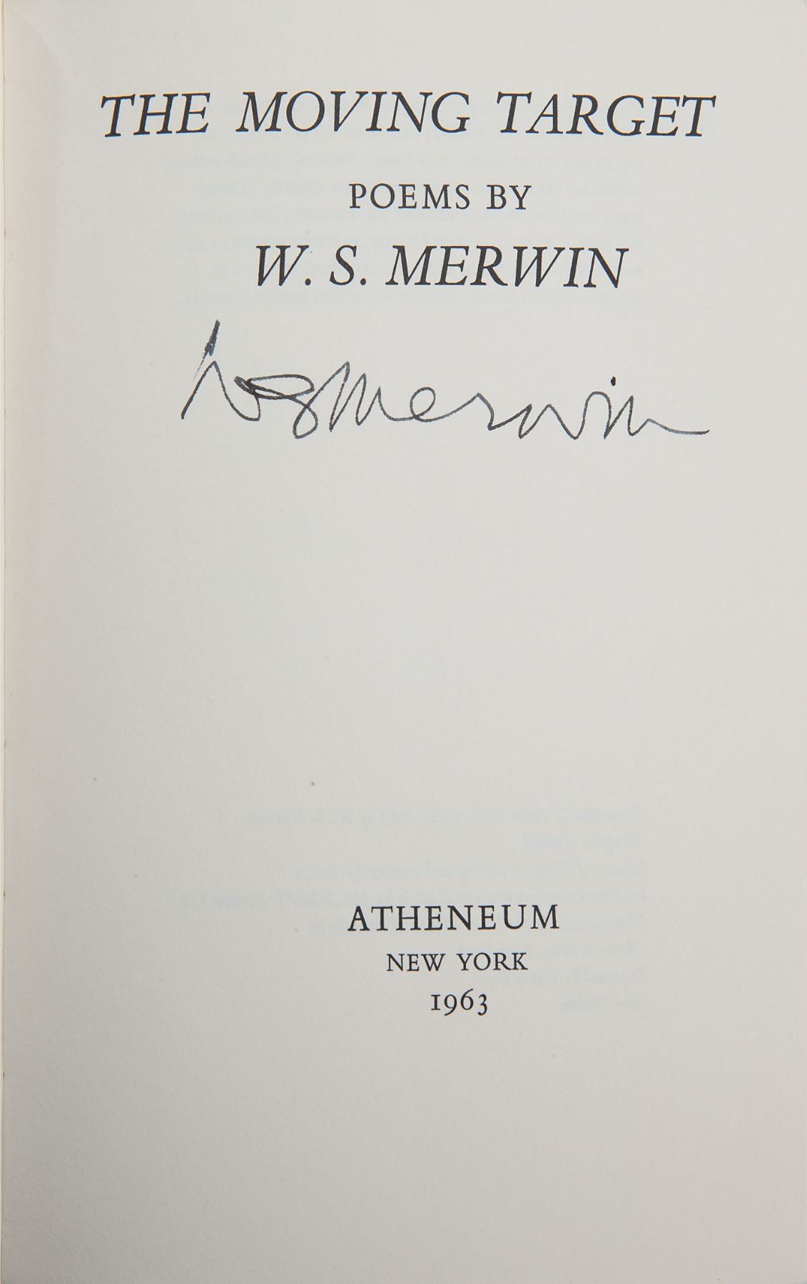 Group of four books by Merwin, including three signed volumes: a softcover first edition of The Moving Target, published by Atheneum in 1963, signed on the title page in black felt tip; a first edition of Green with Beasts, hardcover with dust jacket, published by Alfred A. Knopf in 1956, signed on the title page in black felt tip; a first edition of The Dancing Bears, hardcover with dust jacket, published by Yale University Press in 1954, signed on the title page in black felt tip; and an unsigned first edition of The Moving Target, hardcover with dust jacket, published by Rupert Hart-Davis in 1967. In overall very good to near fine condition.