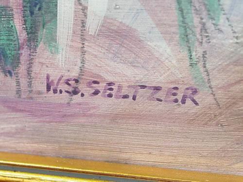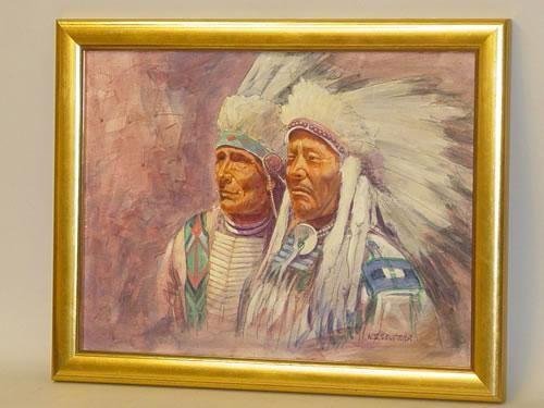 W.S. SELTZER OIL ON ARTIST BOARD OF 2 NATIVE AMERICAN INDIAN CHIEFS IN FULL DRESS-(20TH CENT.) SIGNED ON LOWER RIGHT W.S. SELTZER IN ORIGINAL FRAME (11 1/2" X 15 1/2") - GOOD CONDITION