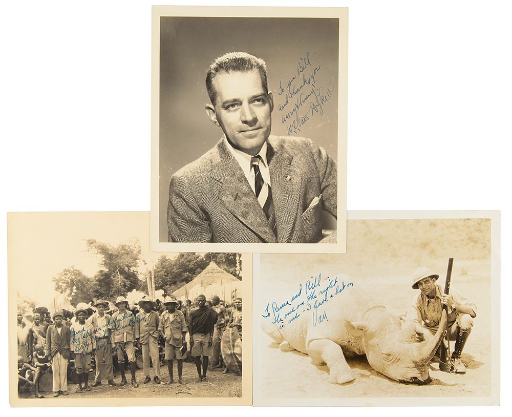 Three different vintage signed and inscribed photos of the famed director, including: a matte-finish 10 x 8 photo of Van Dyke with African villagers, signed and inscribed in fountain pen, "Rena - My African interpreters, sorry I didn't teach them your name, Van"; a sepia glossy 10 x 8 photo of Van Dyke with a lifeless rhinoceros, signed and inscribed in fountain pen, "To Rena and Bill--The one on the right is me--I have a hat on, Van"; and a handsome matte-finish 8 x 10 portrait of the director in a tweed suit and patterned tie (with an MGM/Durward Graybill credit stamp on the reverse), signed and inscribed in fountain pen, "To you Bill, and thanks for everything! W.S. Van Dyke II." In overall fine condition, with scattered creasing, particularly to the rhinoceros photo, and a small chip to the lower left corner of the African villager photo.