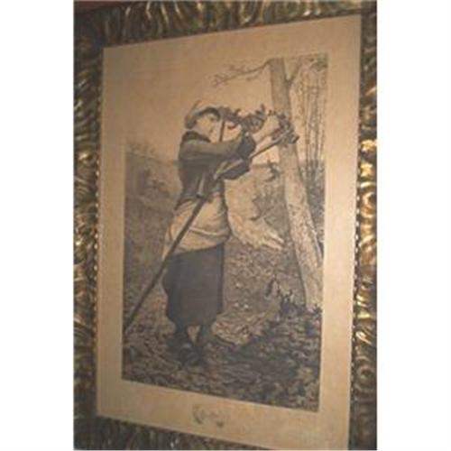 Someone told me that this was a type of print (think it starts with s - but not sketch - more like sies something) Measures 29 1/2 by 22 inches. The frame is a vintage antiqued bronze gold color. The period etching is of a field worker clearing the wooden rake. She is wearing a costume of the era and has wooden shoes. My research indicates that a Walter Satterlee was born in 1844 and died in 1908. I believe this to be one of his works. The print is marked copyright 1886 by W. Wellstood & Co.,NY - I believe that this may also be a limited print. It appears to be signed on the bottom left side by W. Satterlee. Overall condition is good but it does have a few stains on the white trim portion., The sketch is very detailed.