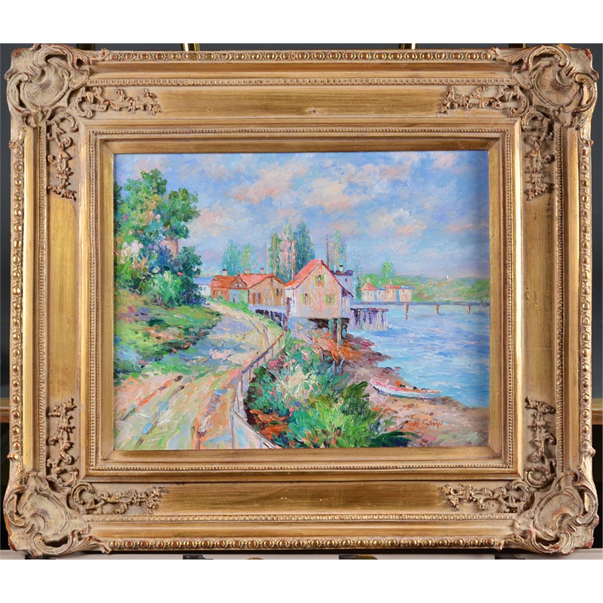 Painted to depict a winding road next to a body of water with several houses alongside. Signed W. Sloan in red in LR. Framed in a carved wood gold painted frame, 15.25" H x 19.25" W, sight, 25.5" H x 30" W, framed. Circa 20th century. Private collection St.Clair Shores, MI.